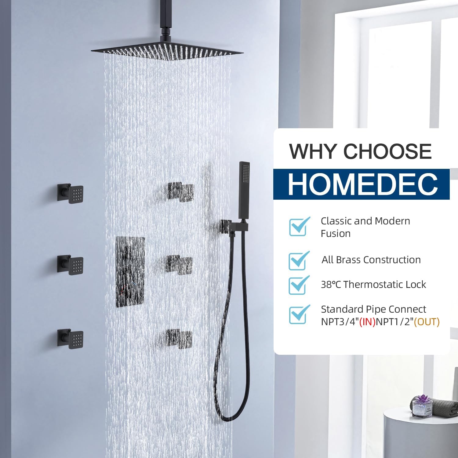 <html xmlns="http://www.w3.org/1999/xhtml"><head></head><body><p>Introducing the HOMDEC shower system, a perfect blend of classic and modern design that will elevate your bathroom’s aesthetic. The shower set is a luxurious addition to any bathroom, crafted with an all-brass construction for exceptional durability and a premium feel. With its sleek, square overhead rain shower, the HOMDEC shower set provides a wide, even spray, offering a relaxing experience akin to a natural downpour.<br /><br /><img src="https://react.homedecbath.com/wp-content/uploads/2024/01/71XAU4fow6L._AC_SL1500_-6.jpg" alt="shower set shower sets set bathroom shower washroom shower set bathroom shower set" width="1500" height="1500" /><br /><br />In addition to the overhead shower, the system includes a handheld shower wand, ideal for targeted cleaning and rinsing. It also features adjustable body jets that can be tailored to massage and relax your muscles, providing a spa-like experience in the comfort of your home. The HOMDEC shower system incorporates a 38°C thermostatic lock, ensuring a consistent water temperature throughout your shower and preventing any unexpected hot or cold surges.<br /><br />Installation of the HOMDEC shower system is straightforward, thanks to its standard pipe connect (NPT3/4"(DN20)-NPT1/2"(DN15)), making it compatible with most existing bathroom plumbing setups. Beyond its functional benefits, the HOMDEC shower system stands as a statement piece, blending sophistication and comfort seamlessly.<br /><br />The company behind the HOMDEC shower system, Guangzhou HomeDec Sanitary ware co.,ltd, specializes in designing and manufacturing high-quality shower and faucet bathroom accessories. Their commitment to excellence is evident in the shower system’s all-brass construction, ensuring long-lasting durability and a luxurious feel. With over 10 years of production experience and advanced production facilities, the company offers global customers professional OEM or ODM services, emphasizing quality control and product authentication.<br /><br />In addition to the shower system, the company’s product range includes bathtub waterfall faucets, wall-mounted waterfall faucets, hand-washing basin waterfall faucets, LED shower heads, and thermostatic valve mixers. Their products are popular worldwide, supported by a policy of "Quality, Reputation, Services, and Mutual Benefits," and are "WaterMark" authenticated, further attesting to their commitment to quality. Customers can trust that the HOMDEC shower system and other products from Guangzhou HomeDec Sanitary ware co.,ltd unleash a perfect balance of functionality and elegance, enriching any bathroom environment with a touch of luxury and sophistication.</p></body></html>