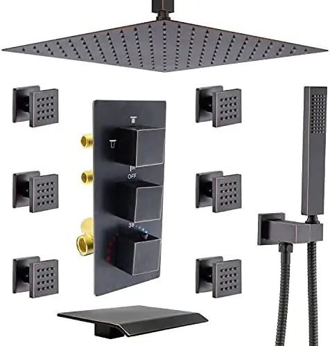 A standout feature of this bathroom shower set is the ultra-thin rainfall shower head, measuring an expansive 16 inches in diameter. This enormous head offers a full-body drenching experience that mimics the soothing sensation of natural rain. It seamlessly blends with contemporary bathroom aesthetics, ensuring a sleek and minimalist look that will elevate your bathroom’s design to a new level. Additionally, the thermostatic control valve allows you to maintain the perfect water temperature with ease. Designed with high-precision controls, this modern ergonomic valve features easy-to-operate levers and a bold matte black finish, adding an elegant touch to your bathroom.