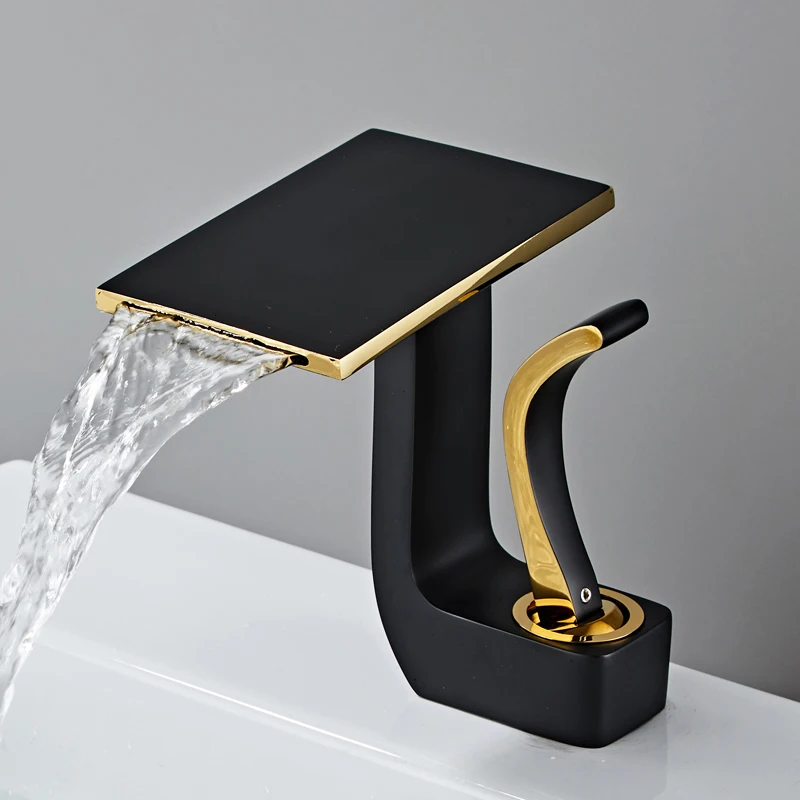 Our new luxury bathroom tap faucet boasts a minimalist yet bold rectangular top surface, meticulously finished in high-gloss white. This pristine surface is artfully framed with an exquisite gold trim, infusing a sense of opulence and grandeur into the overall design. The aesthetics of this wash basin faucet are further complemented by its uniquely sculpted handle, seamlessly integrated into the main body and adorned with the same luxurious gold accent. This ensures a cohesive and lavish appearance while providing effortless control over water flow and temperature.