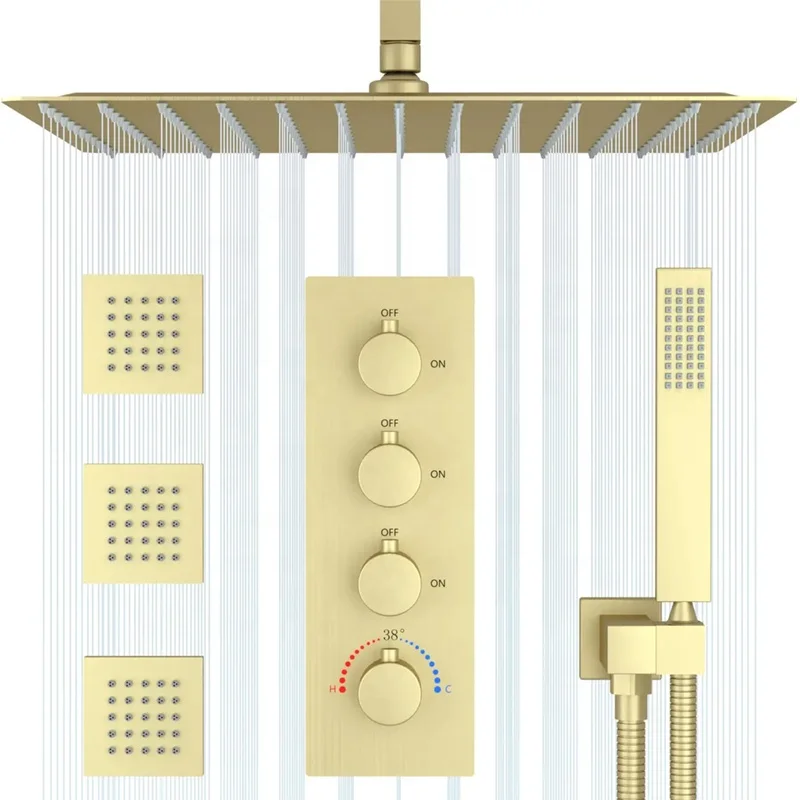 Step into a world of luxury with the Elegant Gold Shower System, your go-to choice for an unparalleled bathing experience. This exquisite shower set by Guangzhou HomeDec Sanitary ware co.,ltd is meticulously crafted to marry aesthetic appeal with high performance. Imagine starting your day with the comforting embrace of a rain shower, provided by the generous square overhead rain shower head, a standout feature in this stunning washroom shower set. It creates a rainfall-inspired stream, enveloping you in tranquility and relaxation.