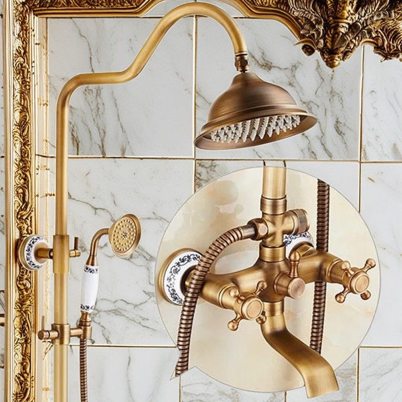 Enhancing your shower experience further is the versatile handheld shower wand. This component adds practicality to luxury, dressed in the same elegant antique brass finish. The ergonomically designed wand ensures a comfortable grip, and its precision nozzle provides a targeted water flow ideal for rinsing or enjoying a more focused shower. This versatility makes the exposed shower system an excellent choice for anyone seeking both style and substance.