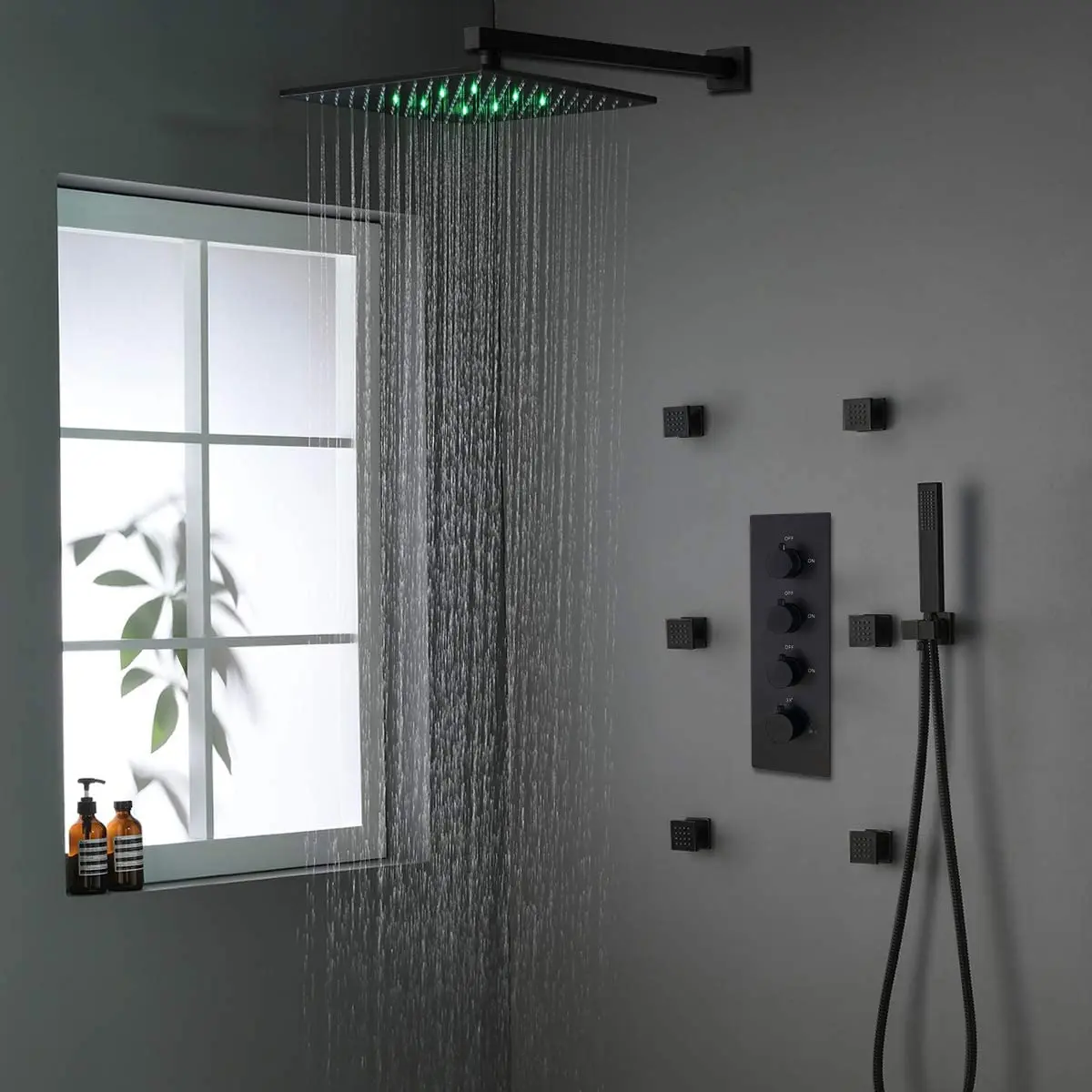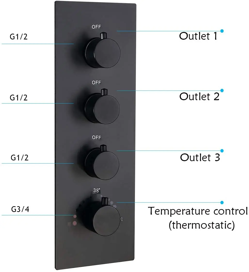 The HOMEDEC shower complete set includes 4 main parts: overhead rainfall shower, body spray, hand shower and thermostatic valve rough & trim