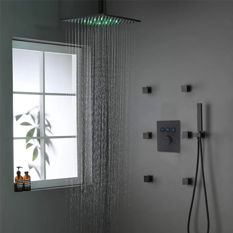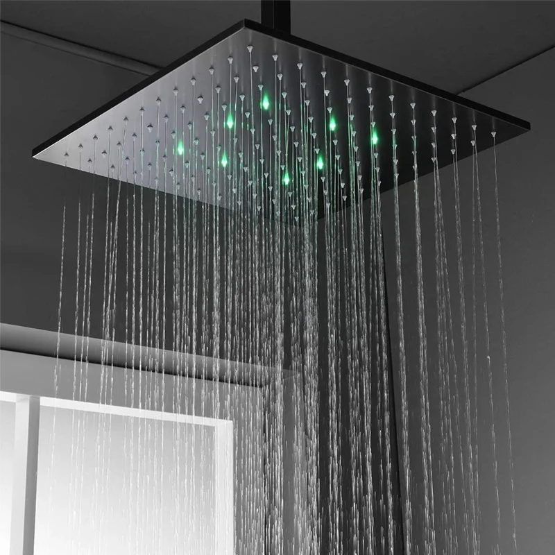 LED colors: Blue: 32-86℉; Green: 86-104℉; Red: 104-122℉(Note: 38℃=100℉) Type: Fixed Rain Showerhead Material: 304 Stainless Steel Feature: Big Enough to Cover Your Body Connection: G1/2″ Standards – RAIN SHOWER ARM 12″