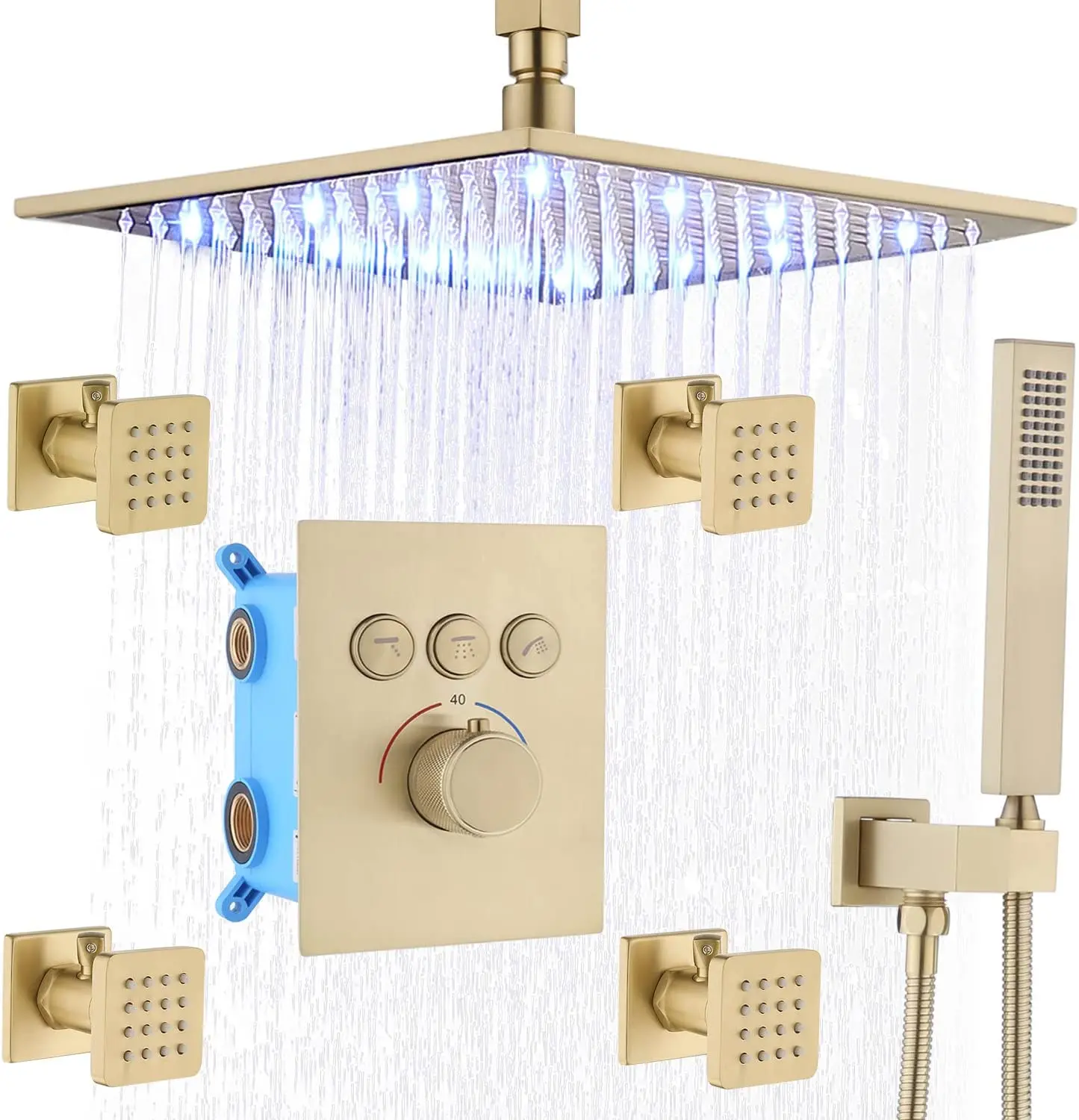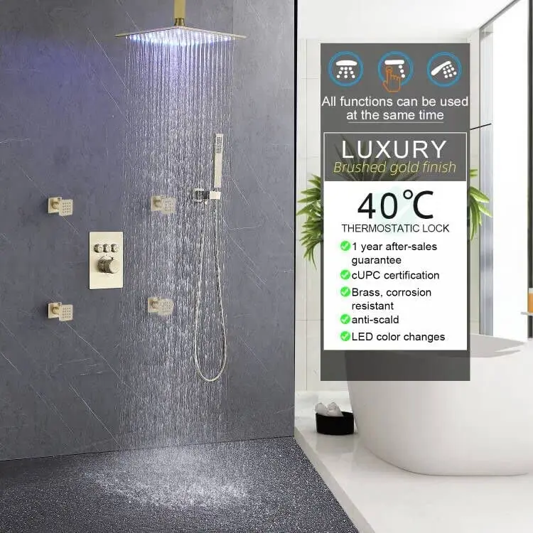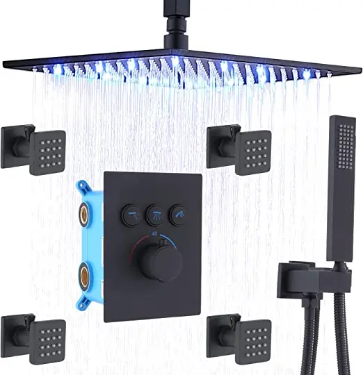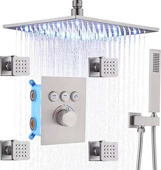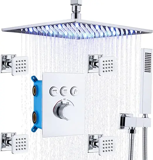 With safety lock, press the button can adjust the hot water, prevent accidentally press scalded. * 【 Material 】 Brass, stainless steel. The smooth polished chrome surface protects against water erosion. Thermostatic shower system with brass structure, corrosion resistant, maintain constant temperature, no sudden cold and hot. * 【4 Shower Body jets 】This body sprays shower system is made of brass. Each nozzle has a separate on/off switch and swivel ball to control flow and Angle independently. Can save water. * 【LED Rain Shower Head】The LED shower system can automatically change the lights according to the temperature of the water to add romance. No battery required. |