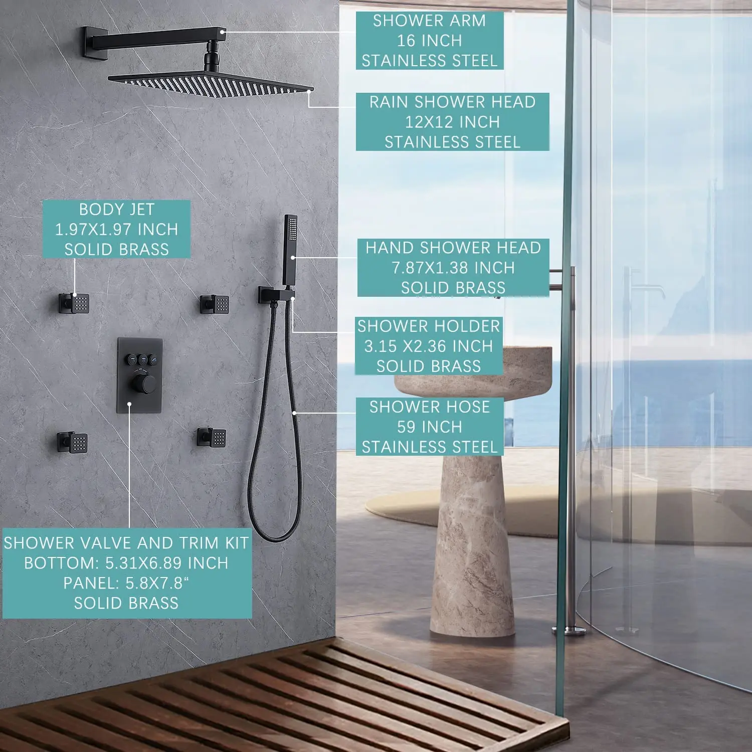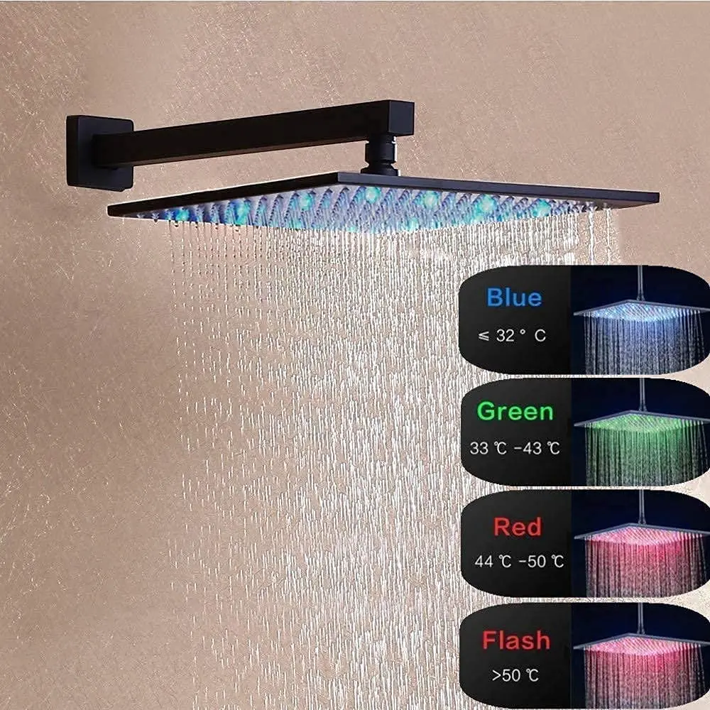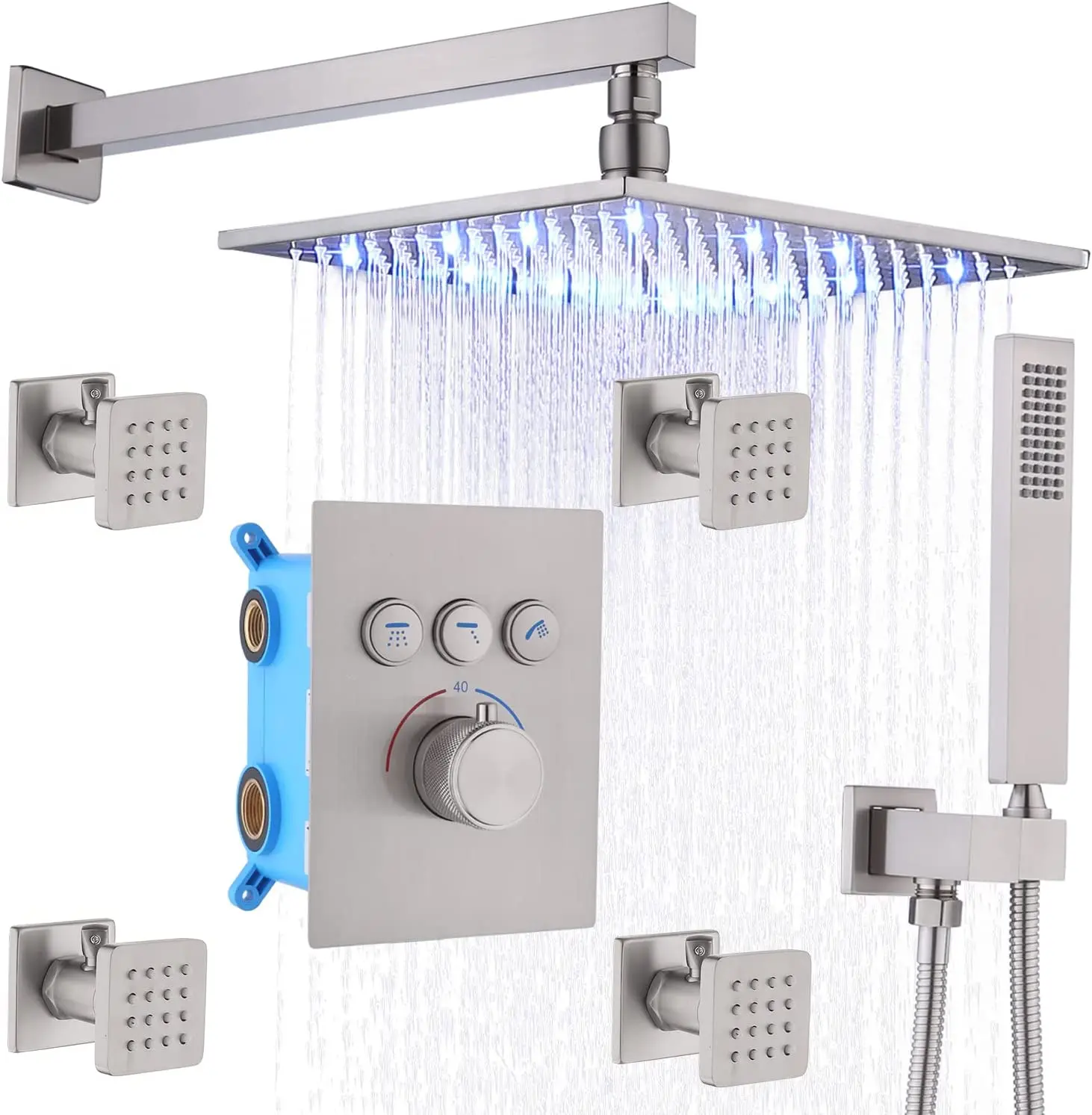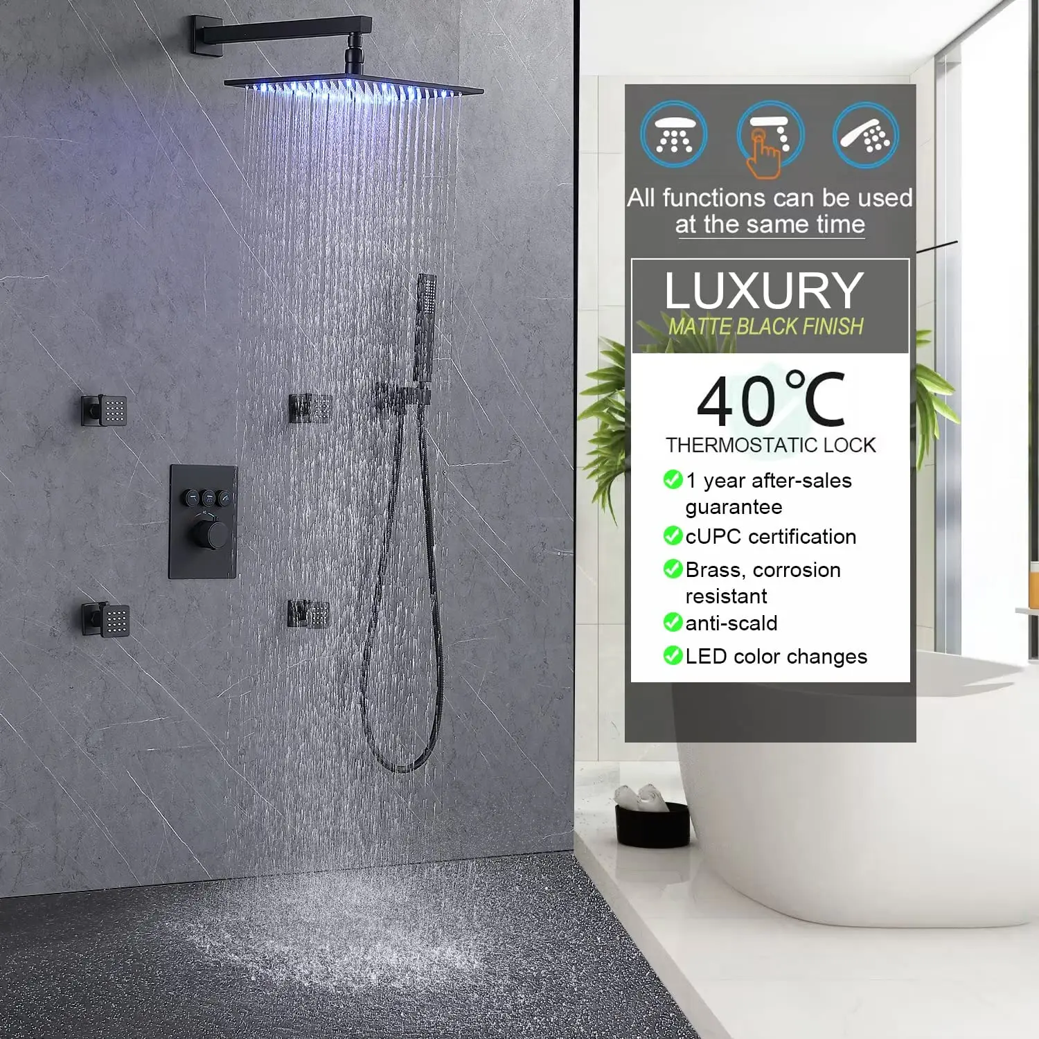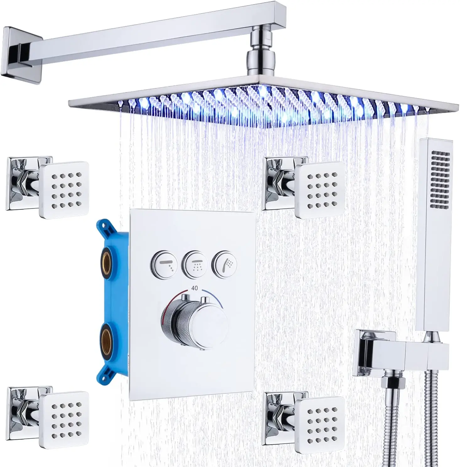 certification, anti-scald function, safe and practical. Individual button design, all shower heads can be used alone or simultaneously. Specially designed safety knobs that stop safely at 40°(104°F) are child and elderly friendly. * uD83DuDC4D【High Quality】 Complete Shower Faucet Set is made of solid brass and 304 stainless steel, Corrosion resistance, no rust, long * uD83DuDC4D【Shower Body Jets with Shut Off Valve】Body sprayer shower system each shower nozzle has a separate switch to control flow and * uD83DuDC4D【Led Square Shower Head 】The 12 inch luxury shower head combo is Large enough to cover your body in the shower. LEDs add |