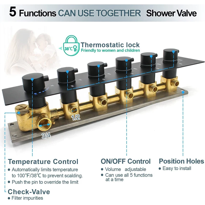 * 【HOMEDEC 5-Way Shower Valve】Built-in mixer device to achieve constant temperature adjustment and effectively avoid burns. Metal brass casting has longer life than ordinary plastic. The switch knob can be used alone or at the same time, and the water flow can be adjusted by twisting slowly.