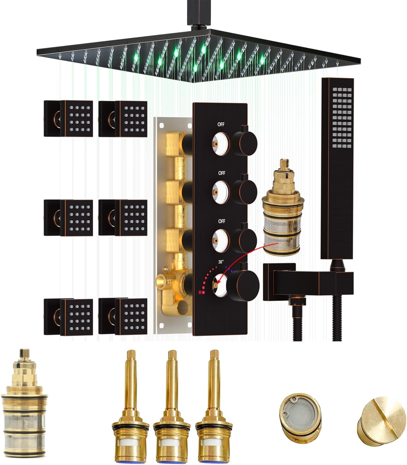 Shower valve cartridge replacement includes 1 temperature cartridge, 3 on/off cartridges, and 2 check valves. All brass casting is rustproof and durable.