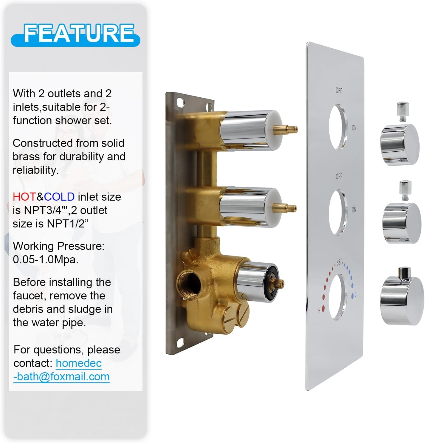 2 Way Shower Diverter Valve Brass 2 Functions Thermostatic Shower Mixing Valve Kit 3 Handle Flow Control Valve, 3/4 Inch Inlet, Can Run Simultaneously(Chrome)