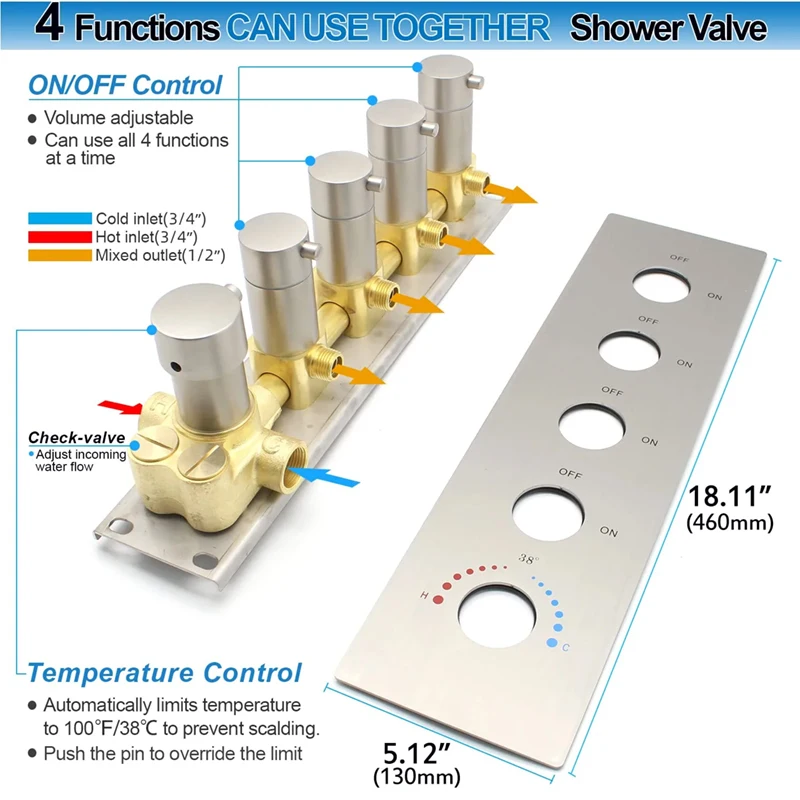 1. Individual control: 4-way showers can be turned on / off separately. Flow can be adjusted by turning the knob.