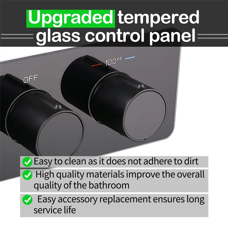 【UPGRADED SHOWER VALVE KIT】:The shower flow control valve is composed of tempered glass panel, high-quality brass and built-in box. The upgraded tempered glass panel is not easy to adhere to dirt, easy to clean, and ensures neat and beautiful. High-quality materials enhance the overall quality of the bathroom. Accessories are easy to replace, guaranteeing service life and avoiding the risk of wall removal and maintenance.