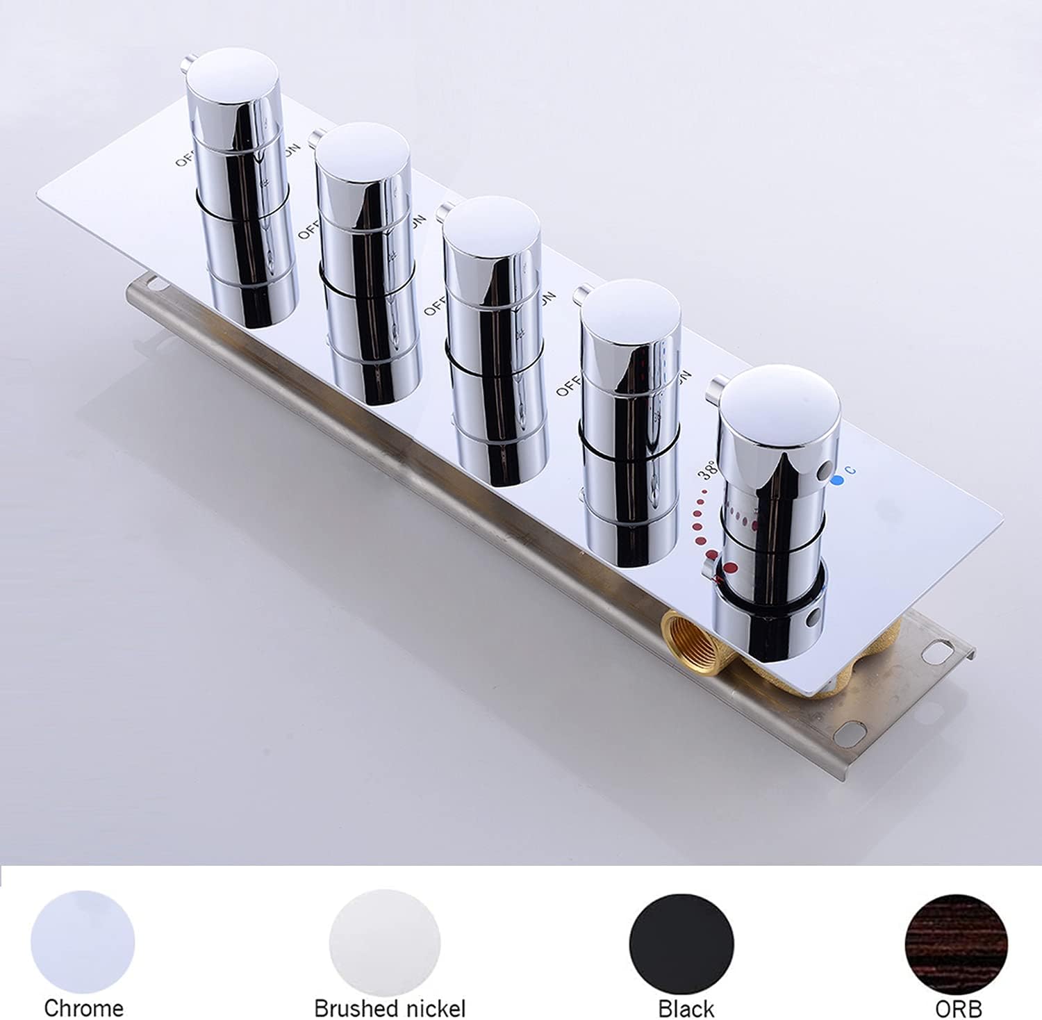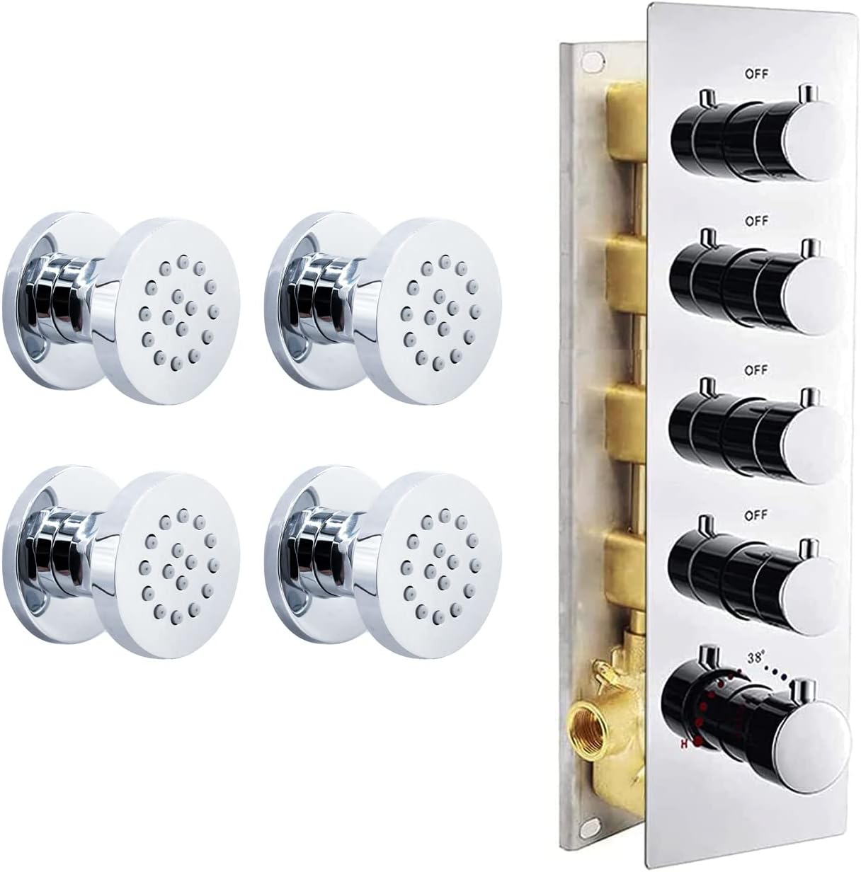 4-Outlet Thermostatic Shower Diverter Mixer Valve and 4 Round Shower Body Spray Brass Massage Jet (Chrome)