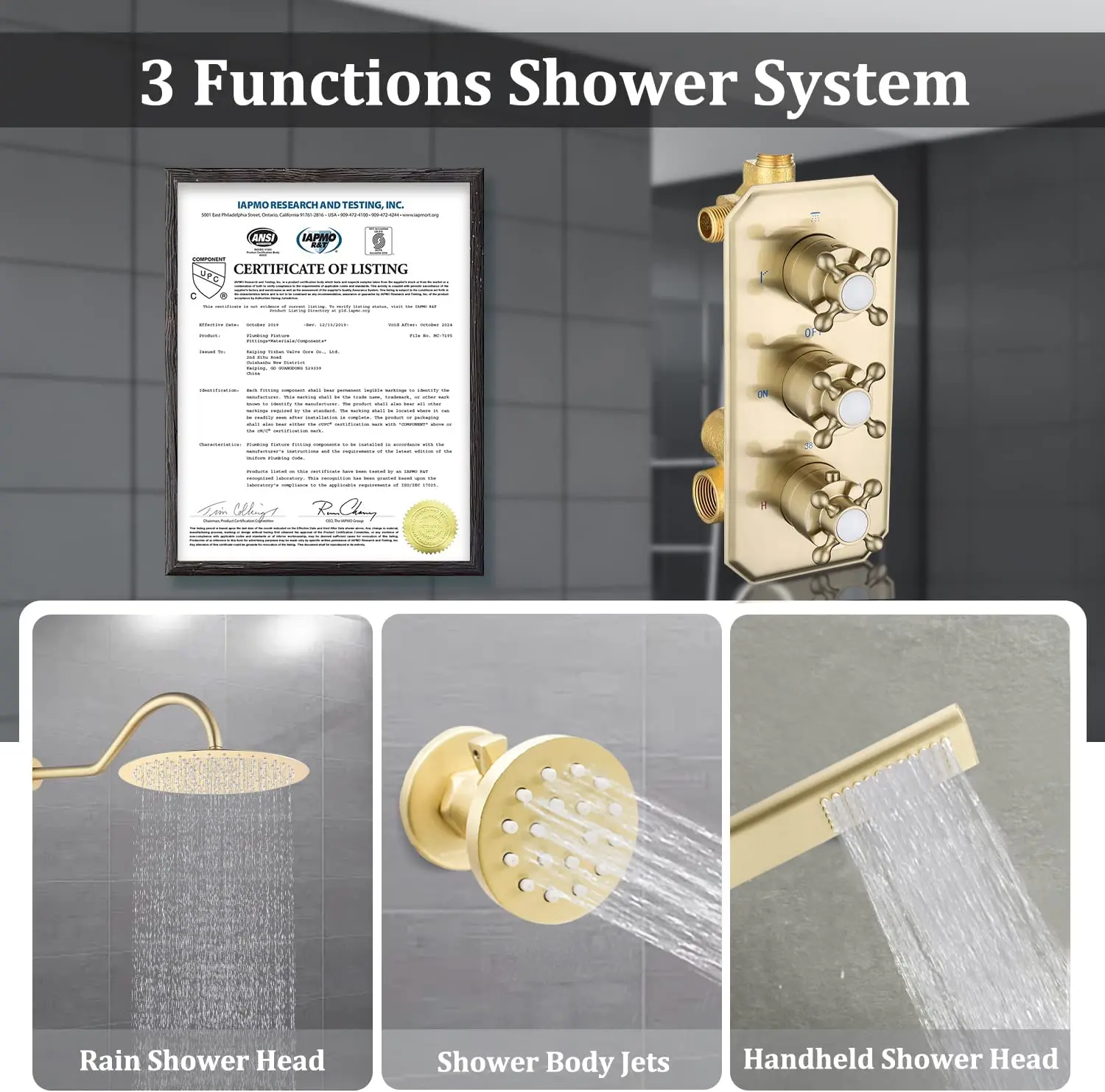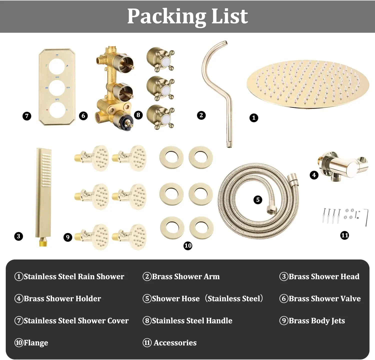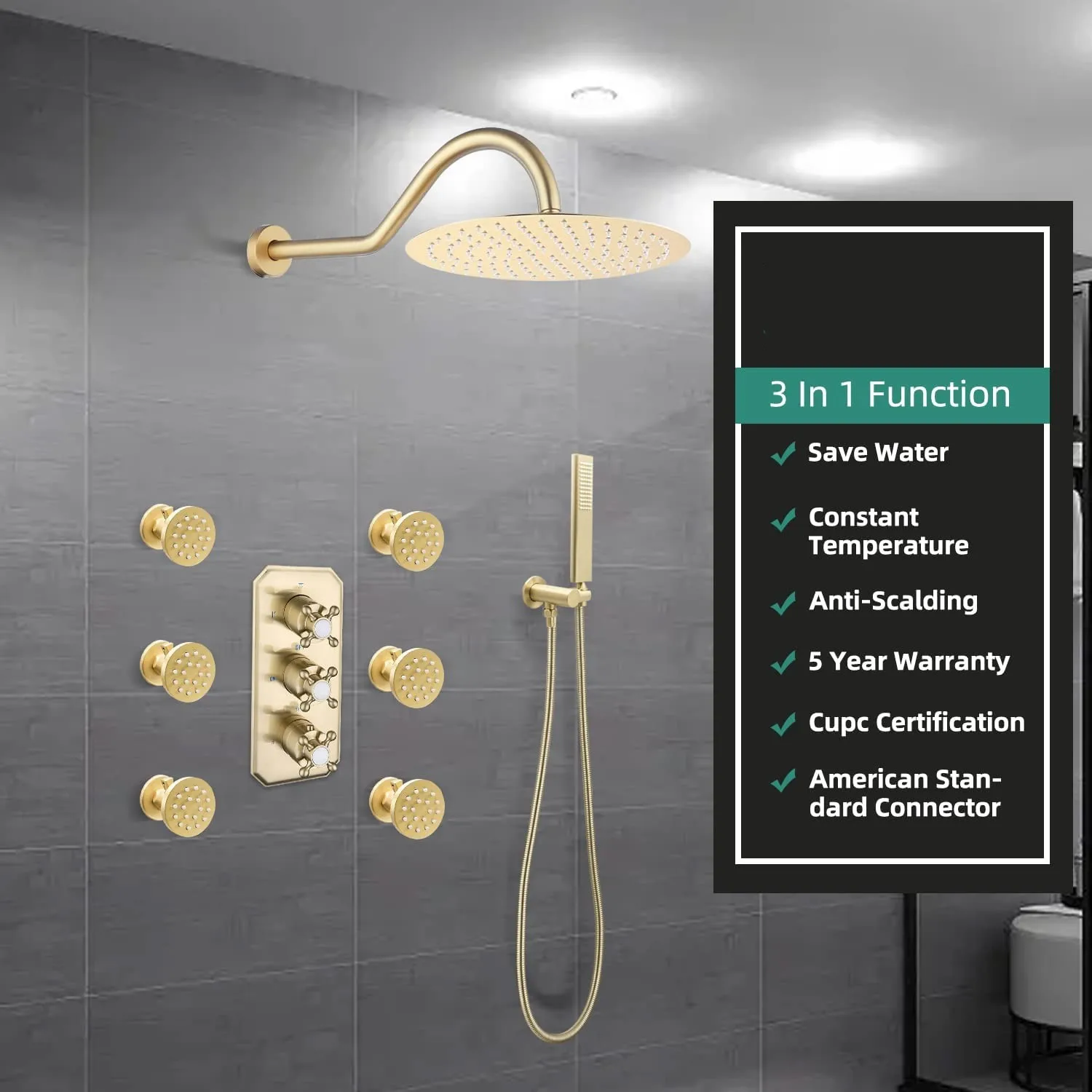 sprays and handheld spray). Save water for environmental protection. * 【6 PCS Body Massage Jets】Each nozzle has an independent switch to control flow. Shower wall jets with adjustable ball joints, you can adjust the direction at 360℃. * 【Thermostatic 3-Way Shower Valve】Thermostatic Shower Mixer Set is made of metal brass, which has a longer life than stainless steel. Thermostatic cartridge, anti-scald, lock temperature at 38℃, do not need to adjust the temperature frequently. * 【Easy to Install】A detailed digital installation manual is uploaded on the product Listing. The luxury rain combo set comes with installation instructions. Please feel free to contact us for any installation questions. |