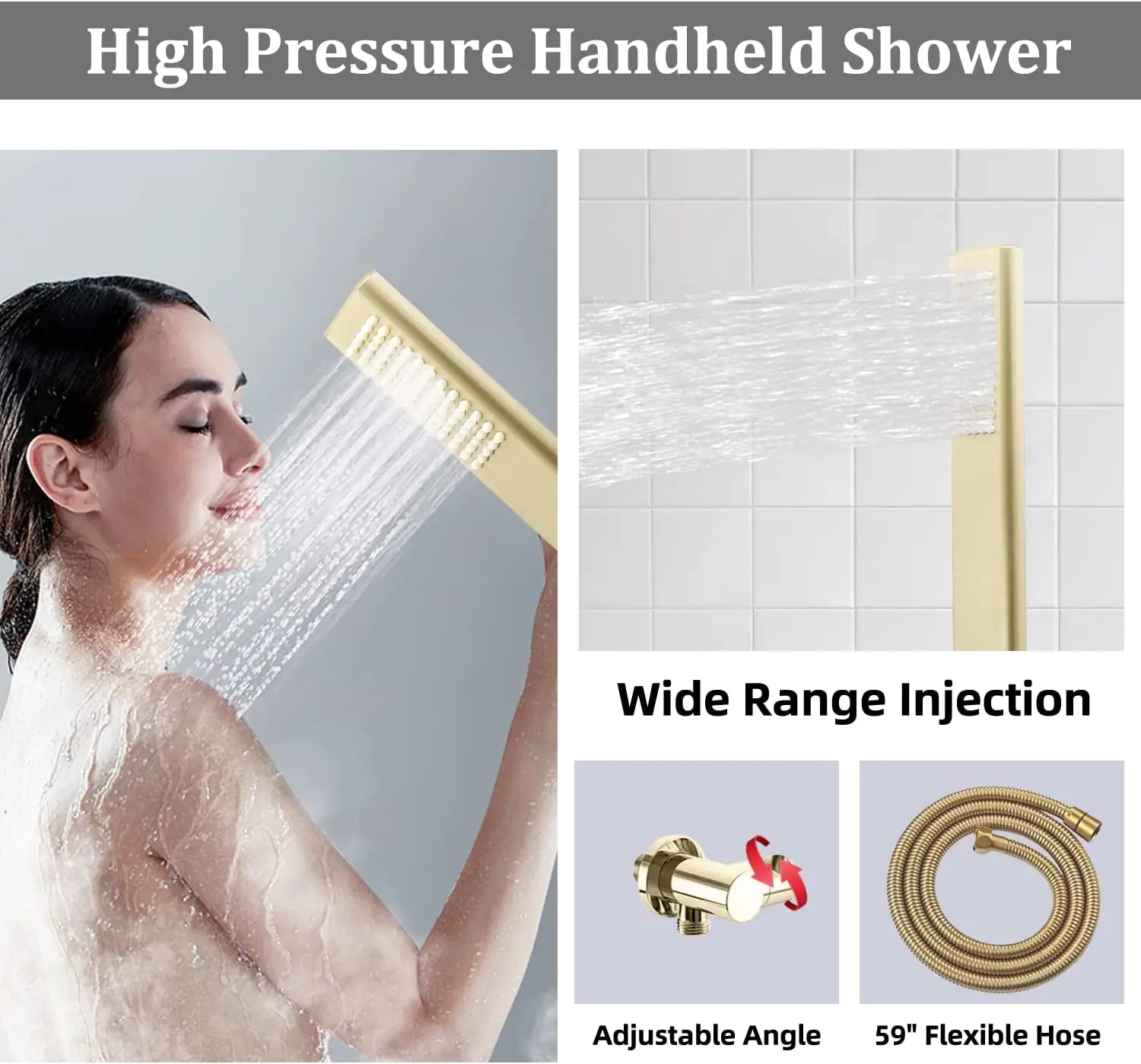 handheld shower head, shower holder and hose, rain shower head, shower body jets, thermostatic shower valve