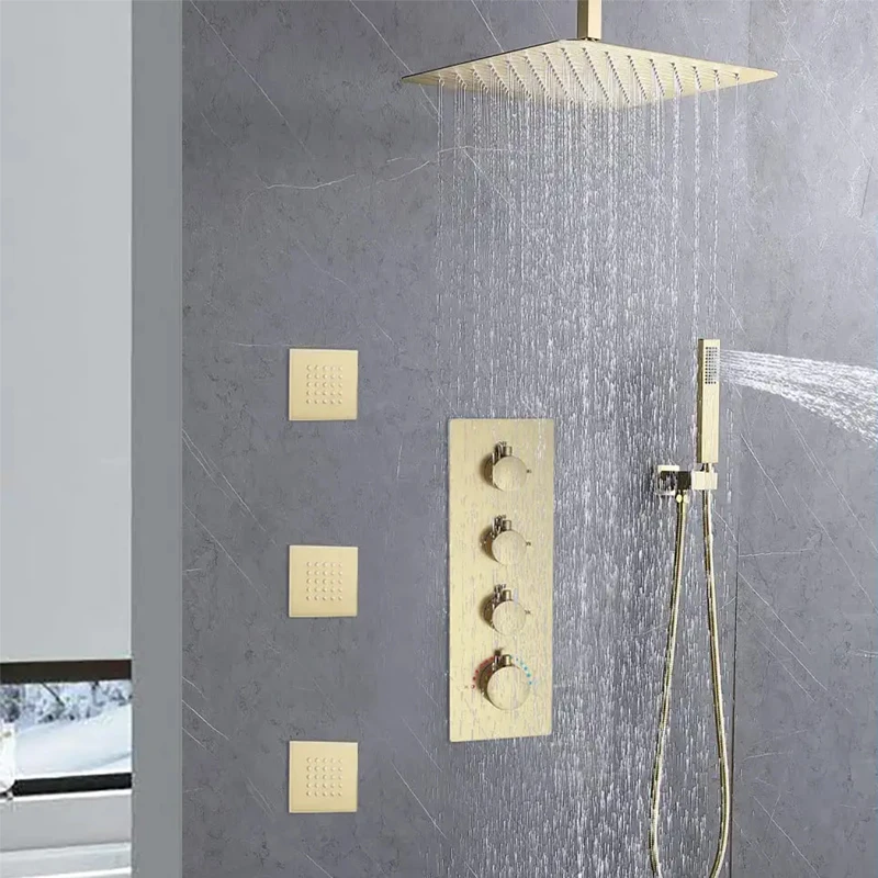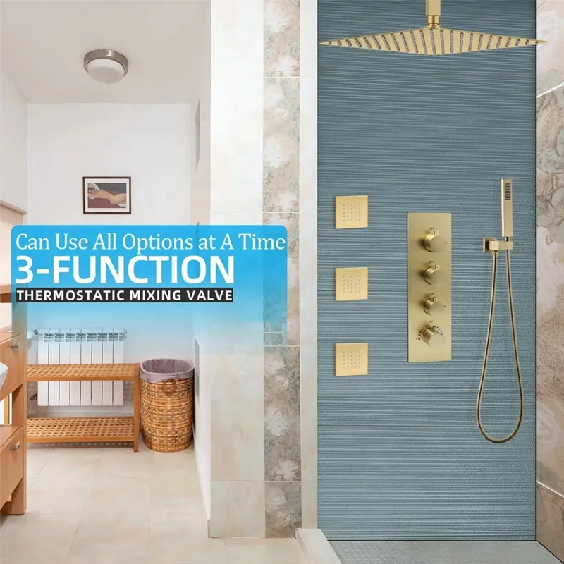 * 【Brushed Gold Shower System】- The water pressure and flow of each showerhead are individually adjusted by knobs, and the shower functions can be used individually or at the same time, bringing you a comfortable and convenient shower experience.