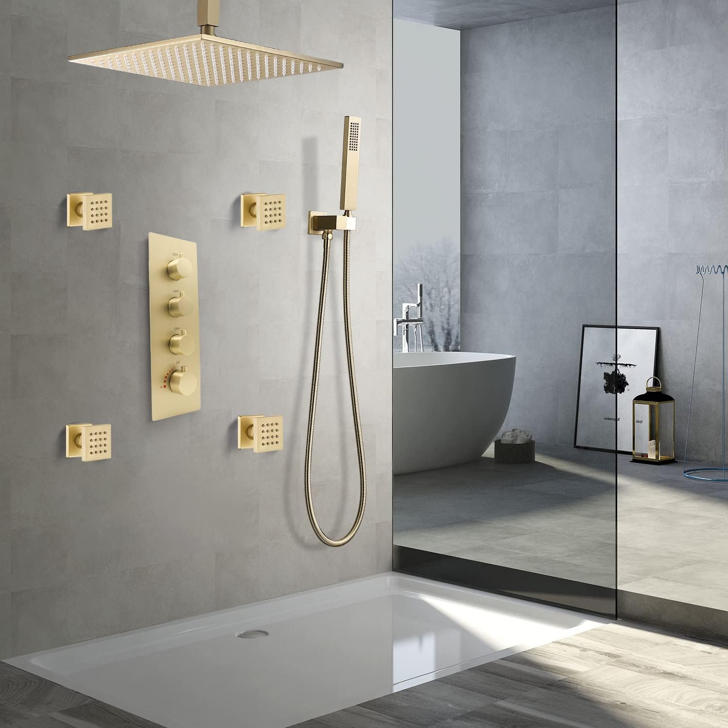 INCLUDING: 4 body spray jets combination, spa like bathroom with casual bath hardware accessories. MATERIAL: Solid brass material + Brushed Gold finished, anti-scratch, ensuring quality and longevity. Adds a modern, fresh look to your bathroom. ADJUSTABLE: Up/down/left/right rotation direction, corresponding to the requirements of you and your family. CONCEALED INSTALLATION: Connect size NPT1/2”, Easy to…