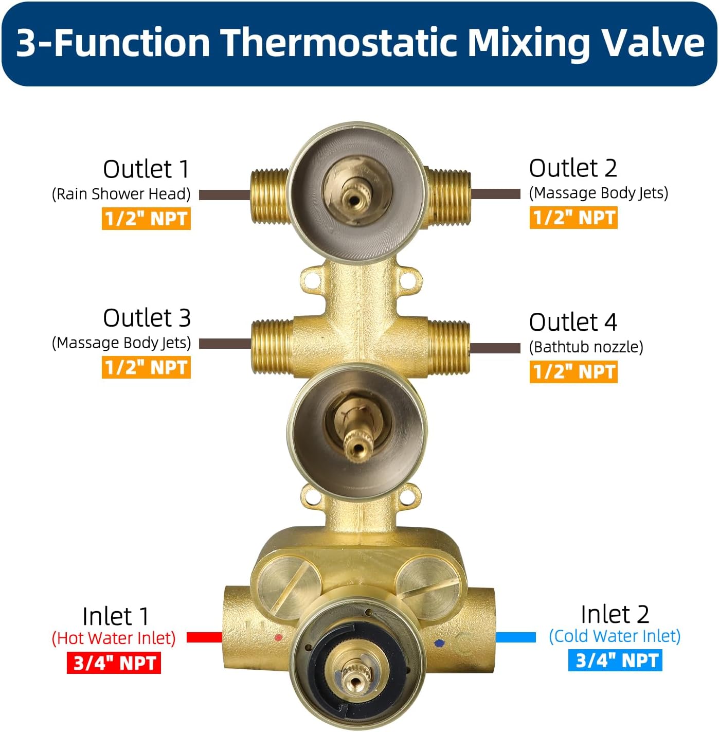 Brushed Gold 4 Ways Shower Diverter Valve, HOMEDEC Thermostatic 4 Outlets 3 Handles Control Shower Mixing Valve Trim Kit Replacement Brass, 3/4inch Rough In