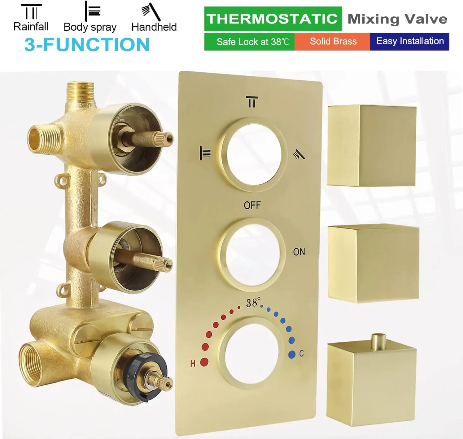 3 Functions: Overhead rainfall shower, 3pcs body sprays, and handheld spray. 3 handles with clear icons, easy to control