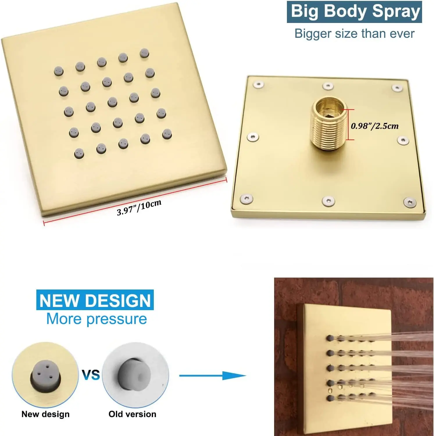 3 fixed body jets adapted with a new design with better performance than the old version. You will enjoy a full body massage shower from head to leg.