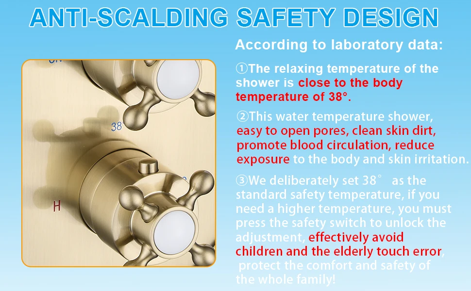 Thermostatic Mixing Valve: Precise Water temperature control, locking at 38℃ (100.4℉), to protect children and the elderly from scalding. No need to adjust the water temperature frequently.