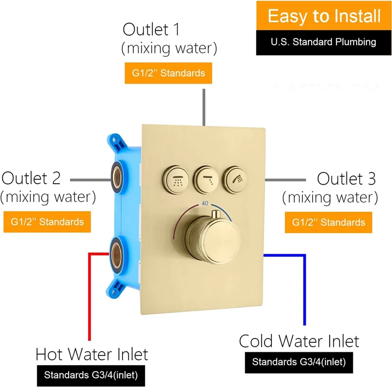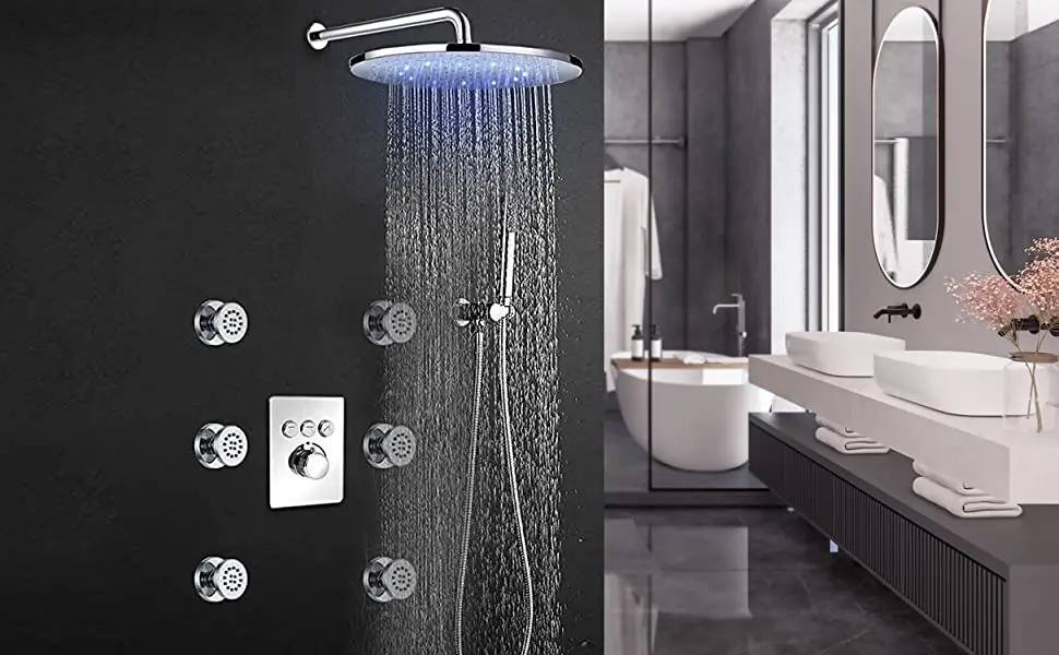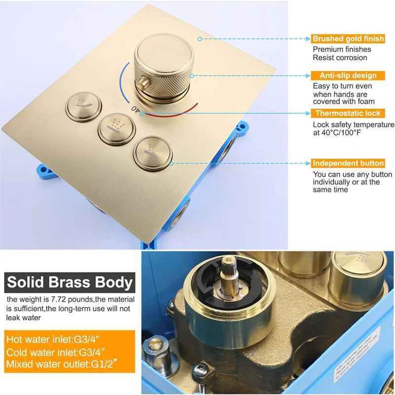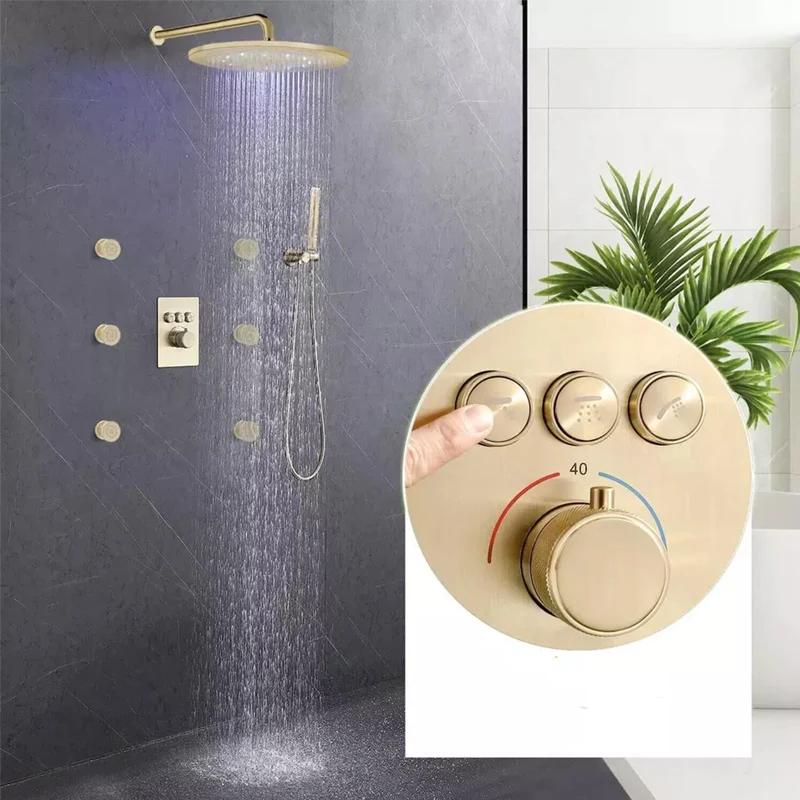 【USE MORE THAN ONE OPTIONS AT A TIME】Brushed Gold shower jet system–Nice about this model vs others, each option is controlled separately so you can turn each one on/off independently. Can protect you from sudden changes in hot and cold water. Very suitable for children and the elderly.
