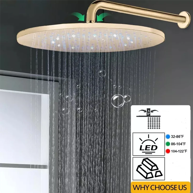 【12″ LED SHOWER HEAD – NO ELECTRICITY NEEDED】Gold shower faucet set – Brushed Gold LED Rain shower system -12″ Large shower body spray system — Enough to cover your body in the shower. LED adds romance or relaxion to your bath time and color changing with water temperature. Safe to use and no need battery.