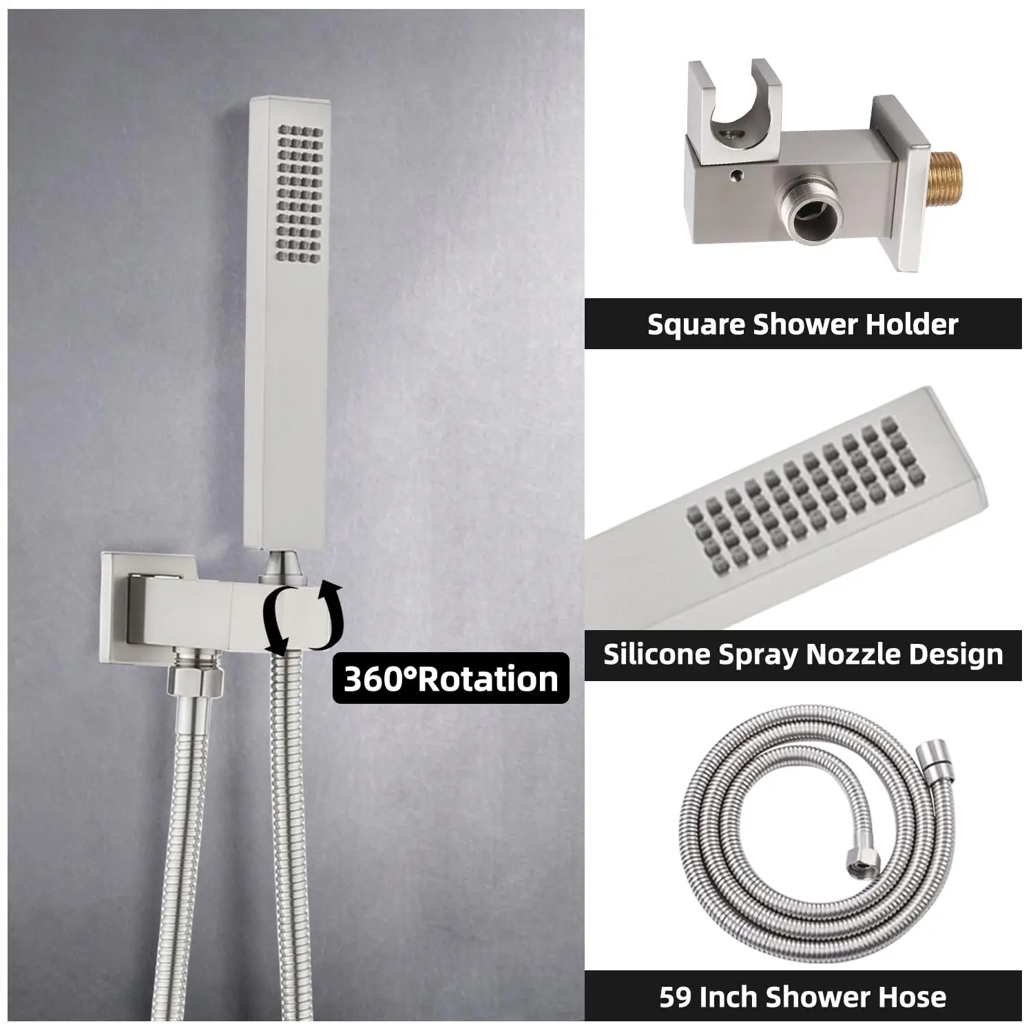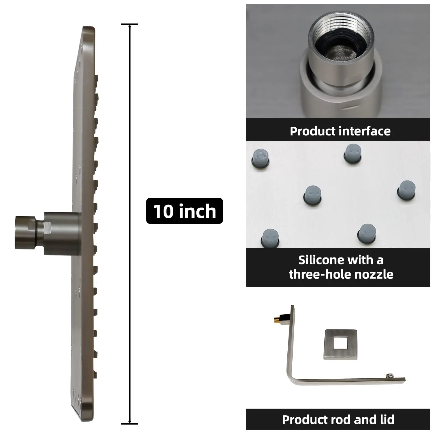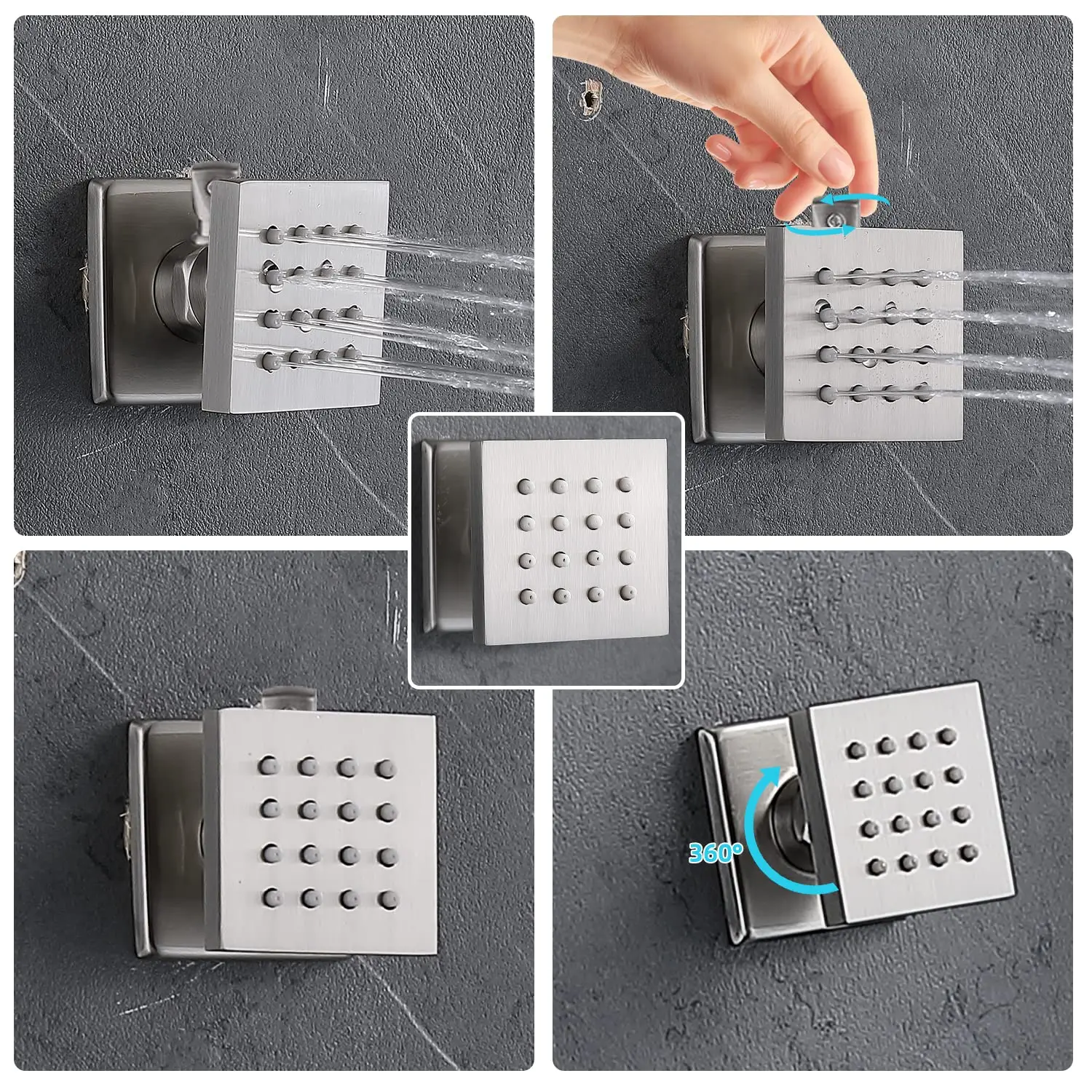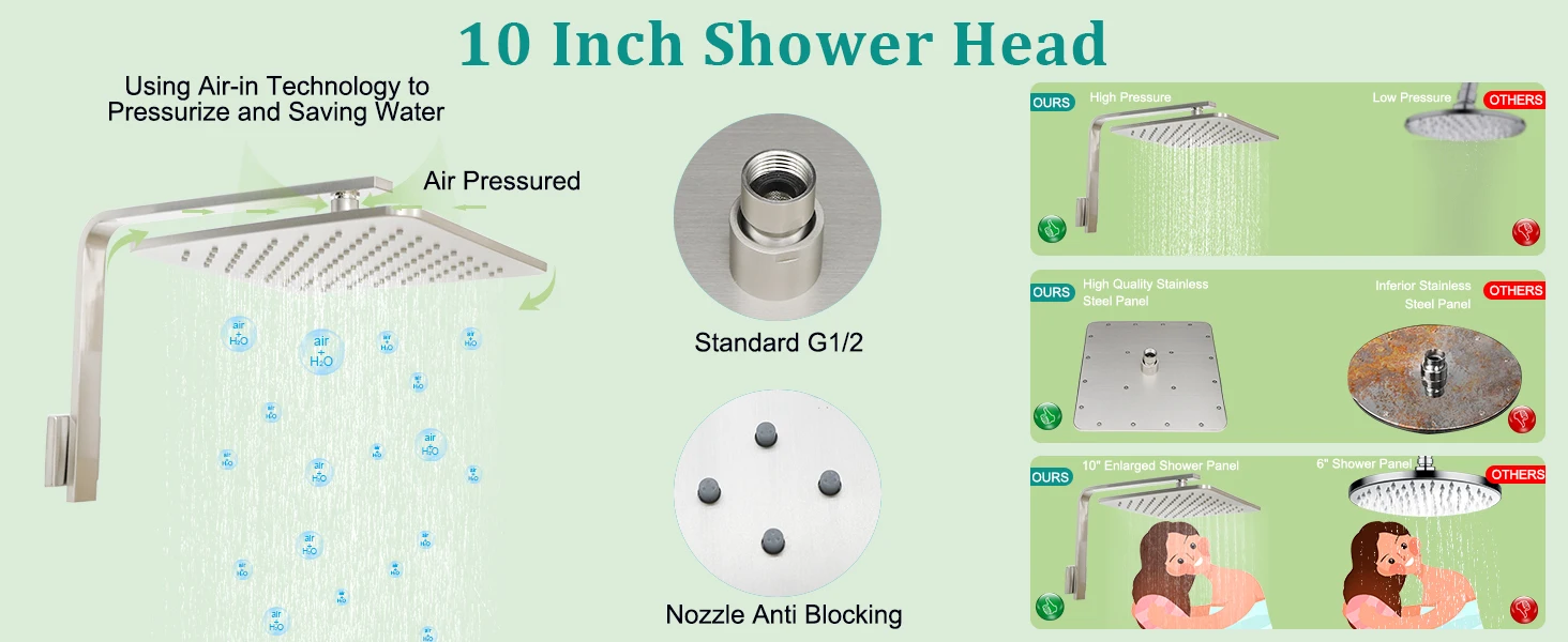 Distinctive design:The 10″ swivel rain shower head is suitable for a wide range of showering spaces and has 112 silicone holes to cover your body, each with three smaller holes for more and smoother water flow.360° rotating sprayer with on/off switch and small handle on the neck for independent control to adjust the water flow or on/off.