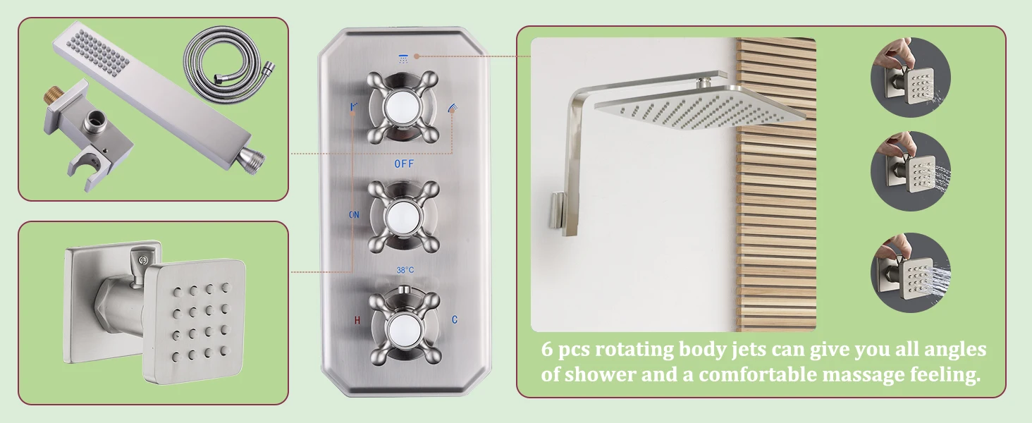 Thermostatic Shower Faucet Set:HOMEDEC Luxury Rain Shower System includes 10″ wall mount shower head, thermostatic valve, handheld shower head and 6 pcs on/off body jets, all designed with adjustable angles to massage your body from all angles, covering your entire body and overlaying light comfort for a rich showering experience.