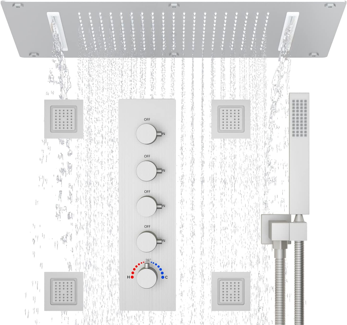 Brushed Nickel 14.96 x 27.56inch Rainfall Waterfall Ceiling Rain Shower System + 5 Handle Rough-in Shower Valve + 4pcs Large Shower Jets Sprayer