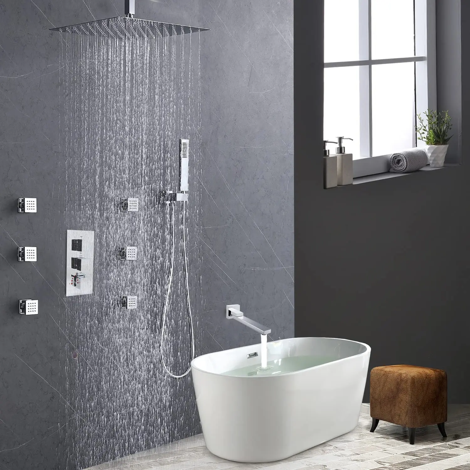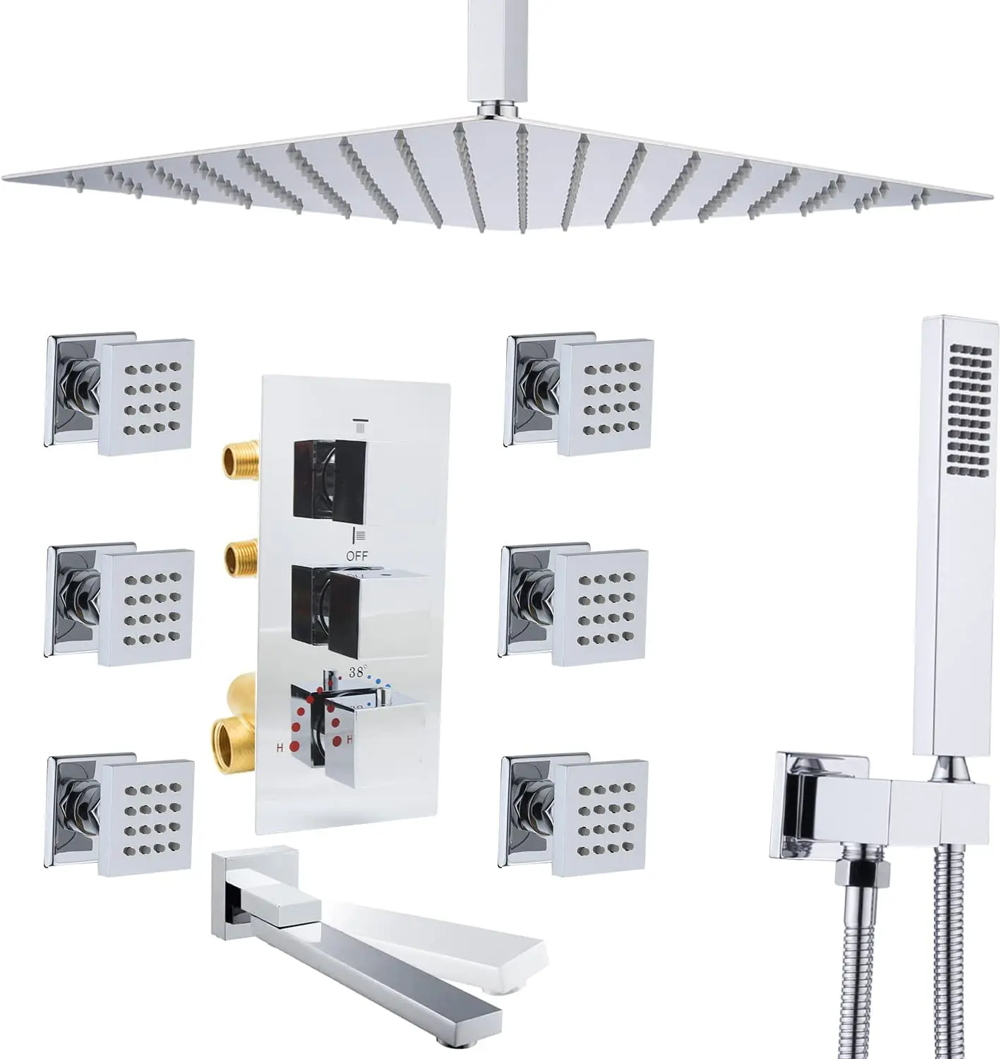 The 16-inch adjustable square rain shower head simulates natural rainfall with a mixture of water and air, giving you maximum full