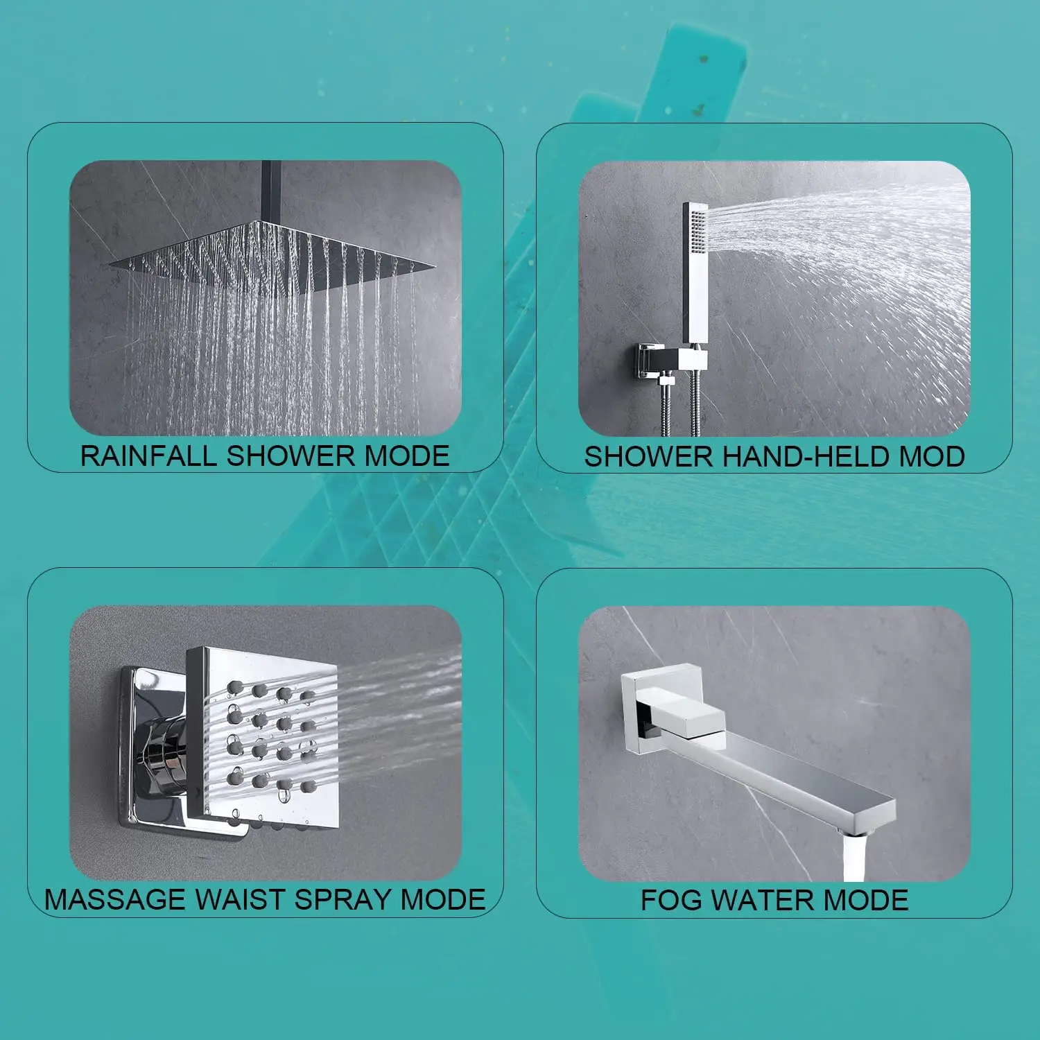 Four shower modes (rainfall shower mode, massage waist spray mode, shower hand-held mode and tub spout mode), you can freely