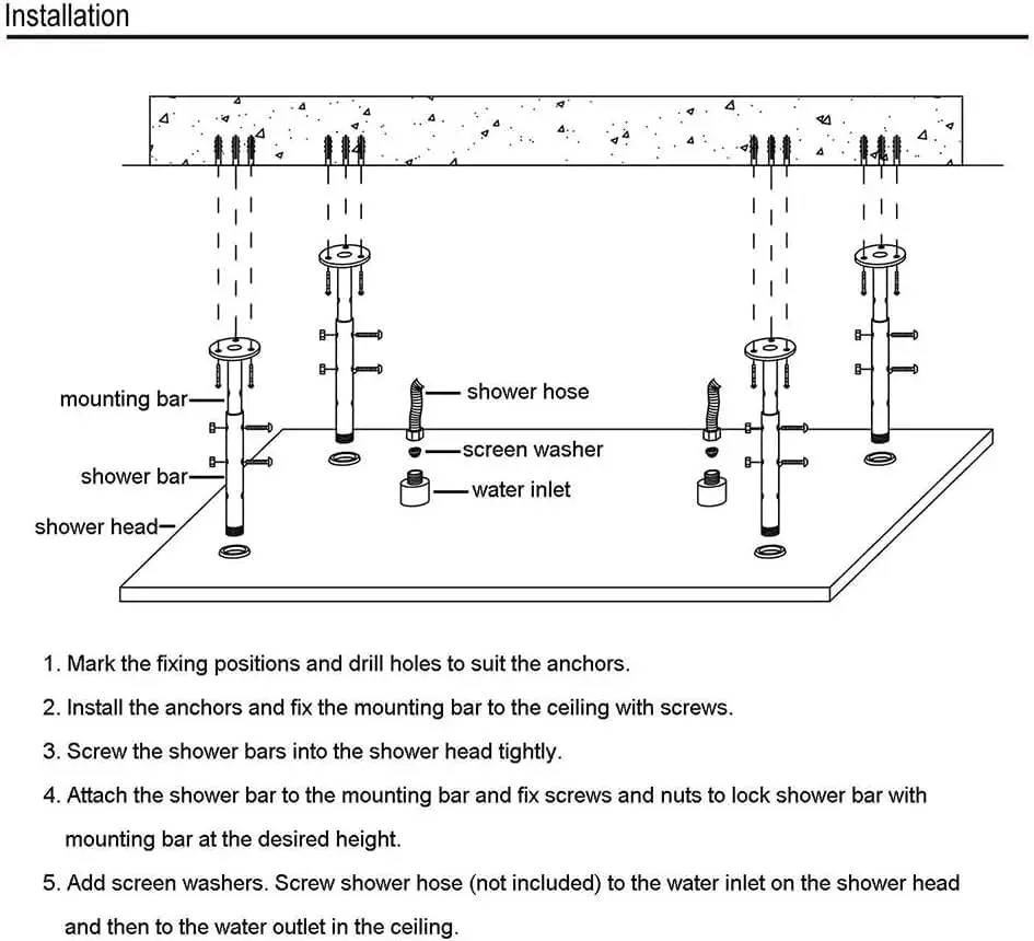 ✿ Shower head comes in size of 20″ x 40″ (500mm x 1000mm) and has two water inlets.