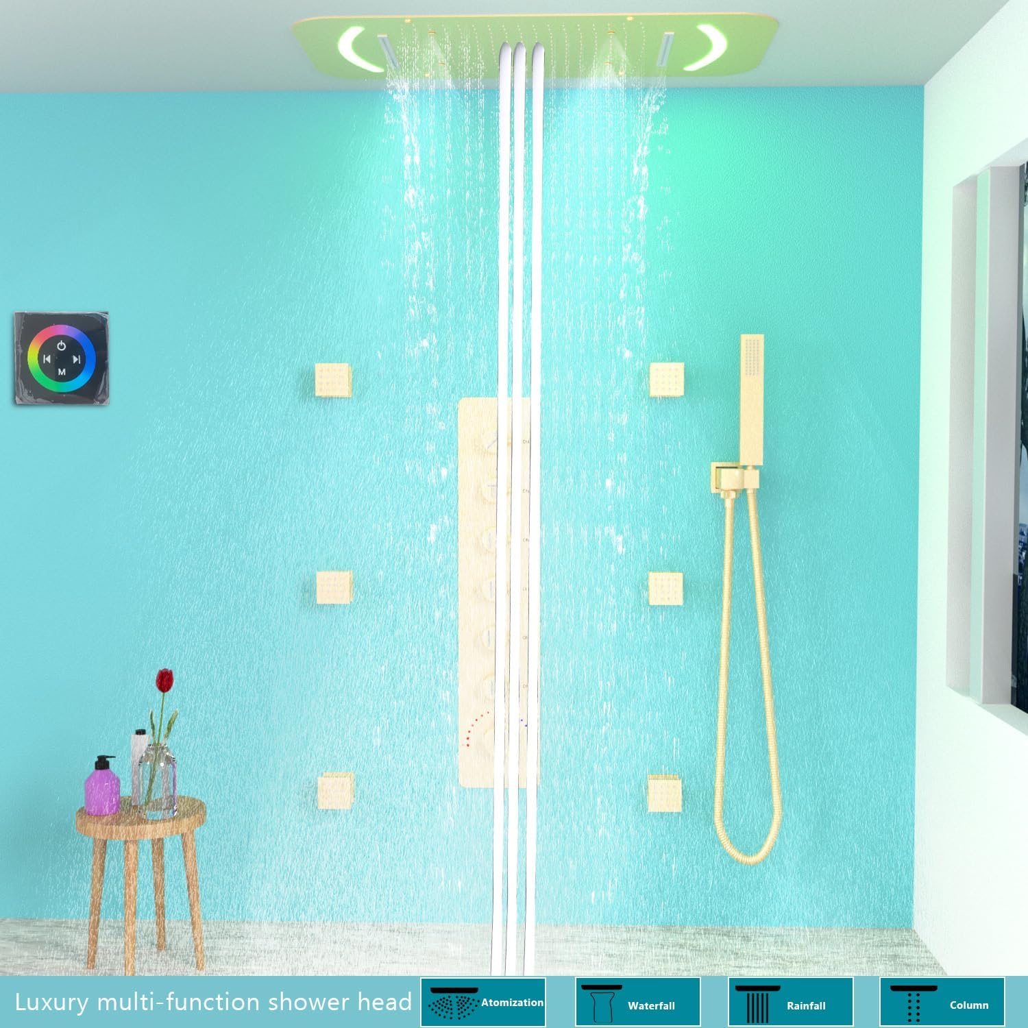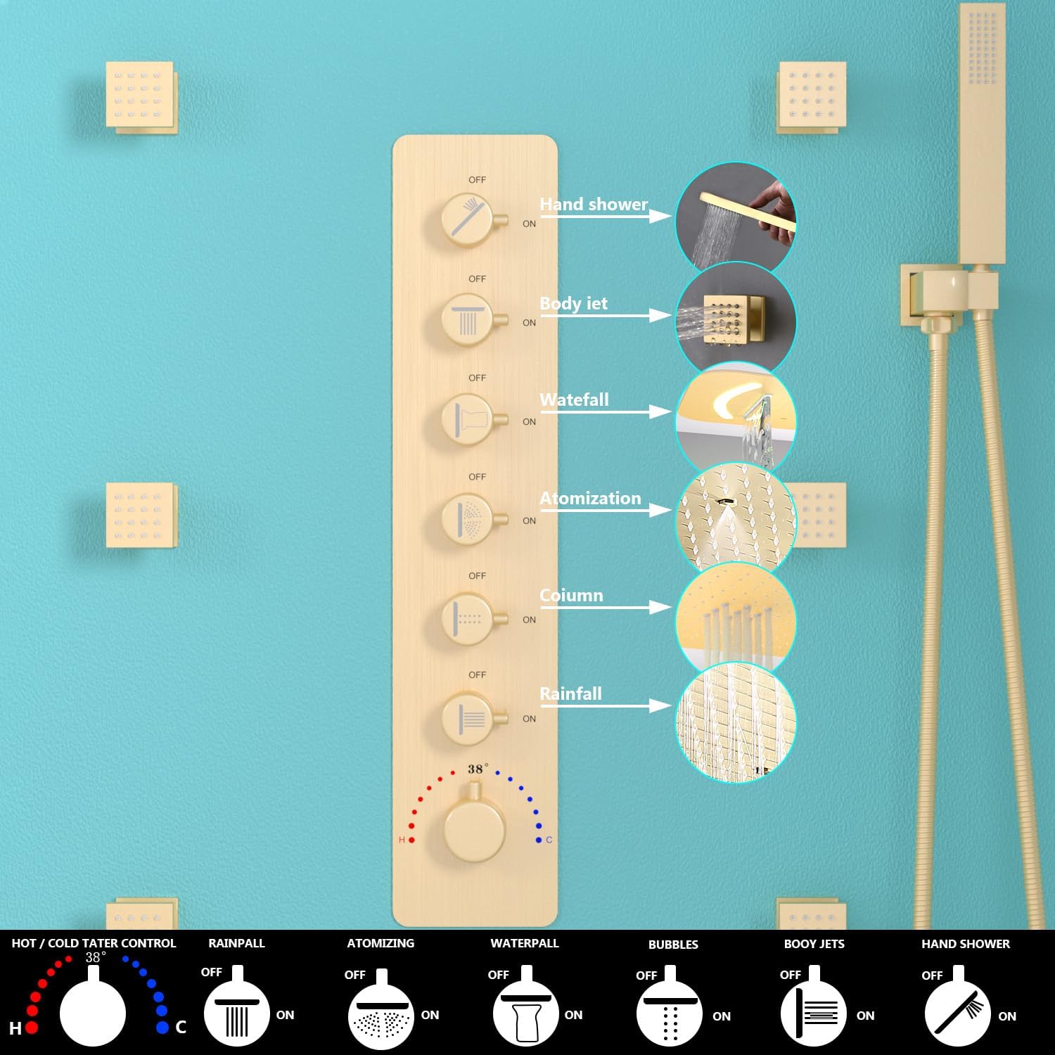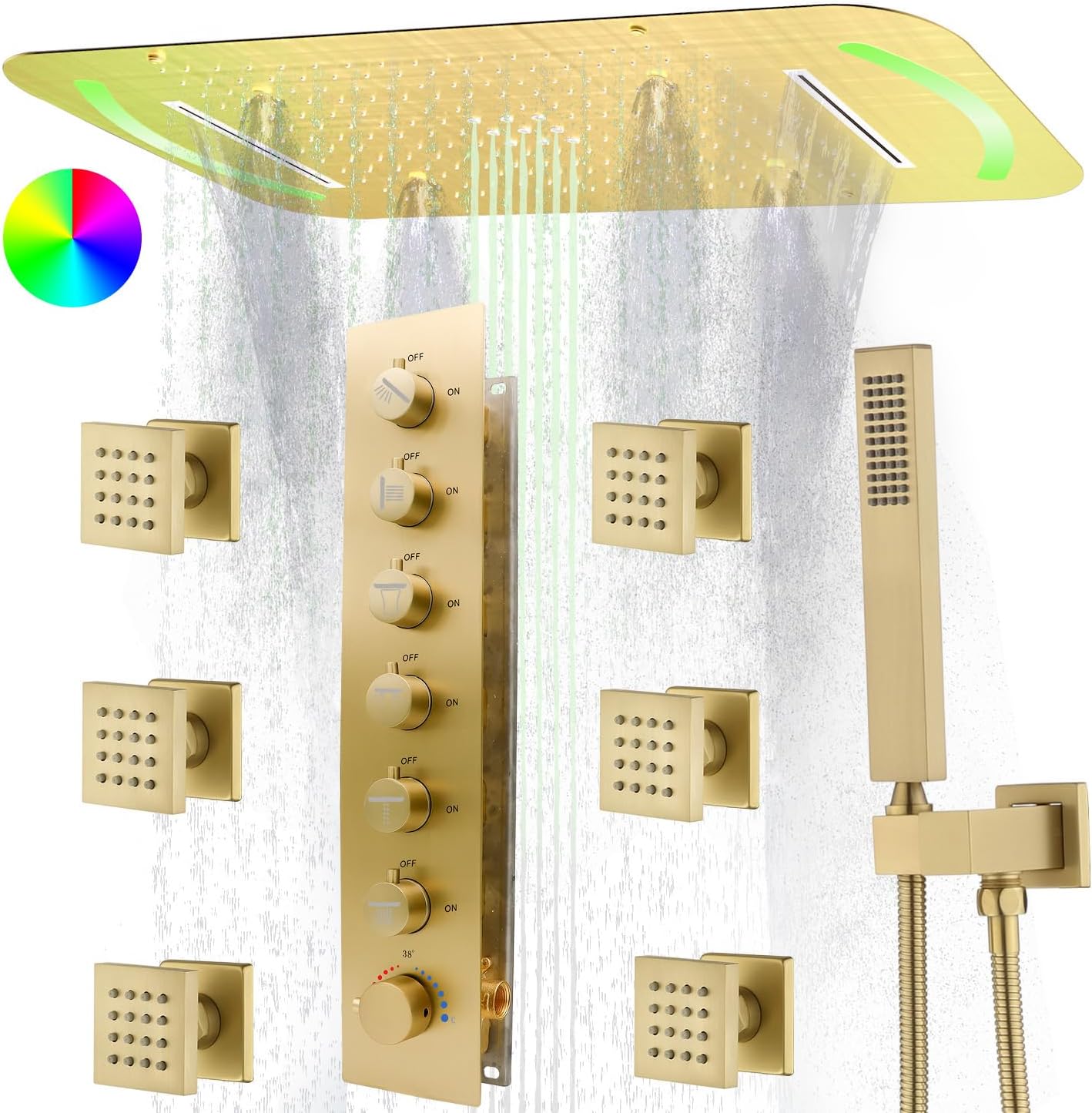 HOMEDEC 4 Functions LED Shower Head System with Rain Shower with 6pcs Body Jet Spray, 27.95inch Rainfall Shower Faucet Set Complete with 6 Way Thermostatic Shower Valve Kit, Brushed Gold