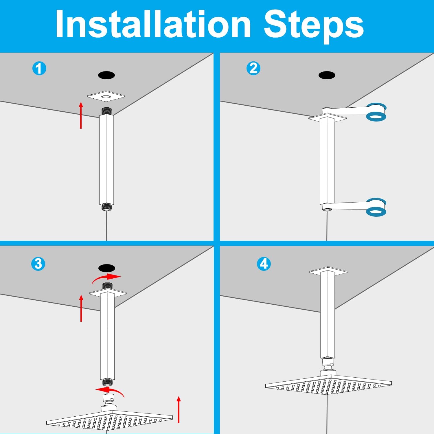 Suitable for ceiling-mount installation. Shower arm extension suitable for all 1/2″ interface kinds of rain shower head.