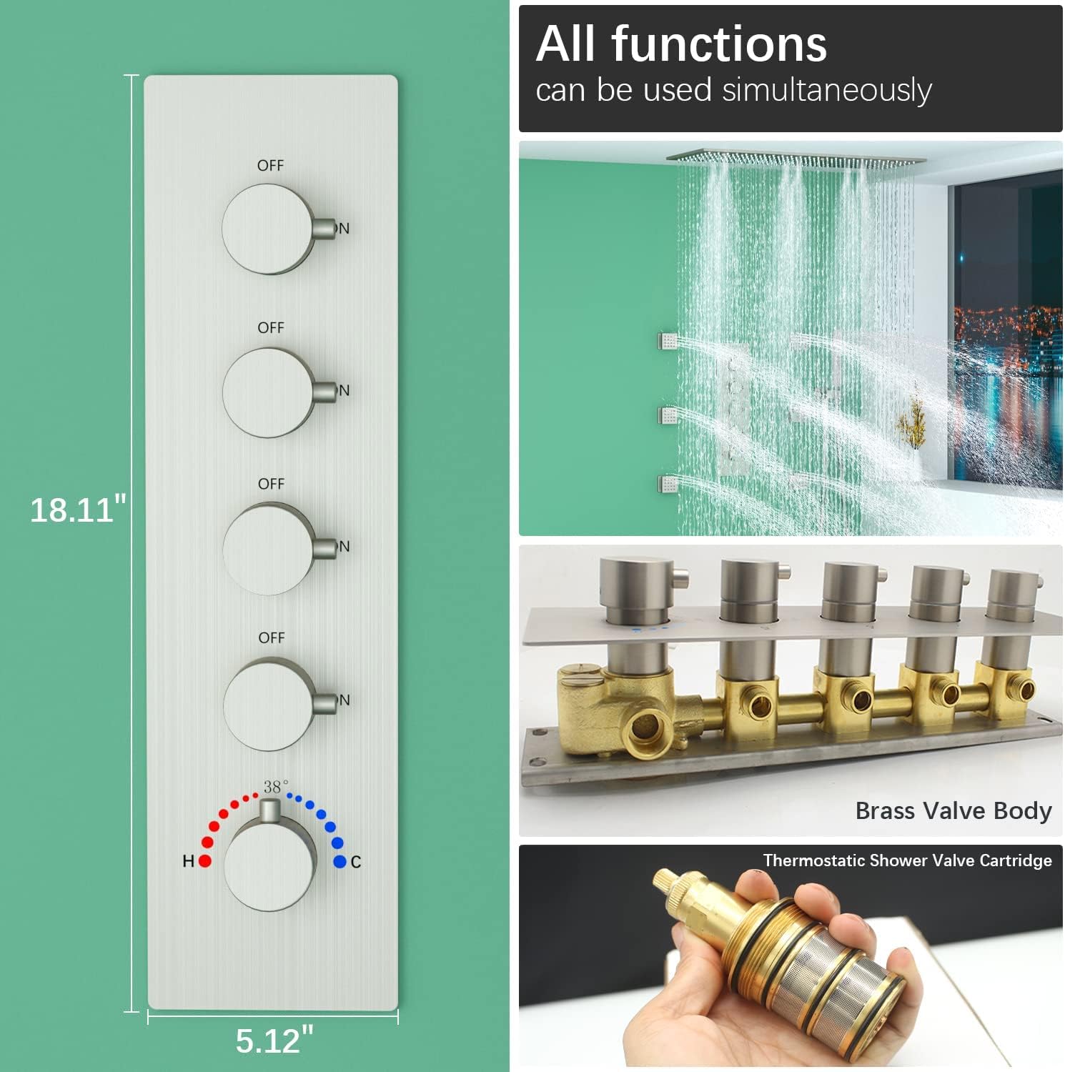 【2-MODE LUXURY SHOWER HEAD】Unique 2-in-1 design makes a difference, large area rain mode and ultra-fine spray mode, with our thermostatic shower valve, you can use one or both functions at the same time. 【THERMOSTATIC 4-WAY SHOWER VALVE】The hot water and cold water are mixed by the mixer to realize constant temperature adjustment and effectively avoid…