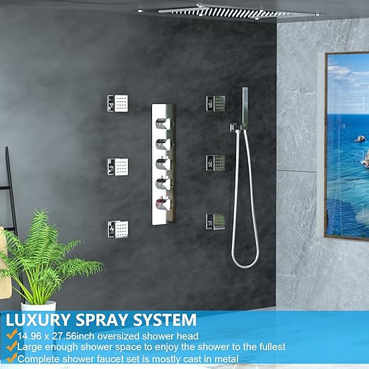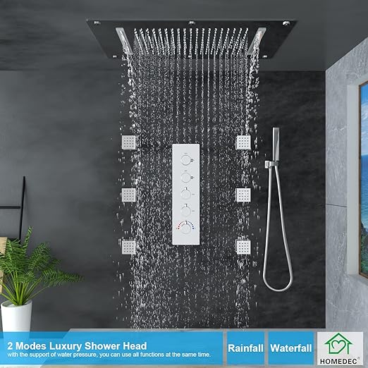 About this item 【2-MODE LUXURY SHOWER HEAD SYSTEM】Unique 2-in-1 design makes a difference, large area rain mode, and comfort waterfall mode, with our 4-way thermostatic shower valve, you can use one or ALL FUNCTIONS AT THE SAME TIME. 【THERMOSTATIC 4-WAY SHOWER VALVE】The hot water and cold water are mixed by the mixer to realize constant…