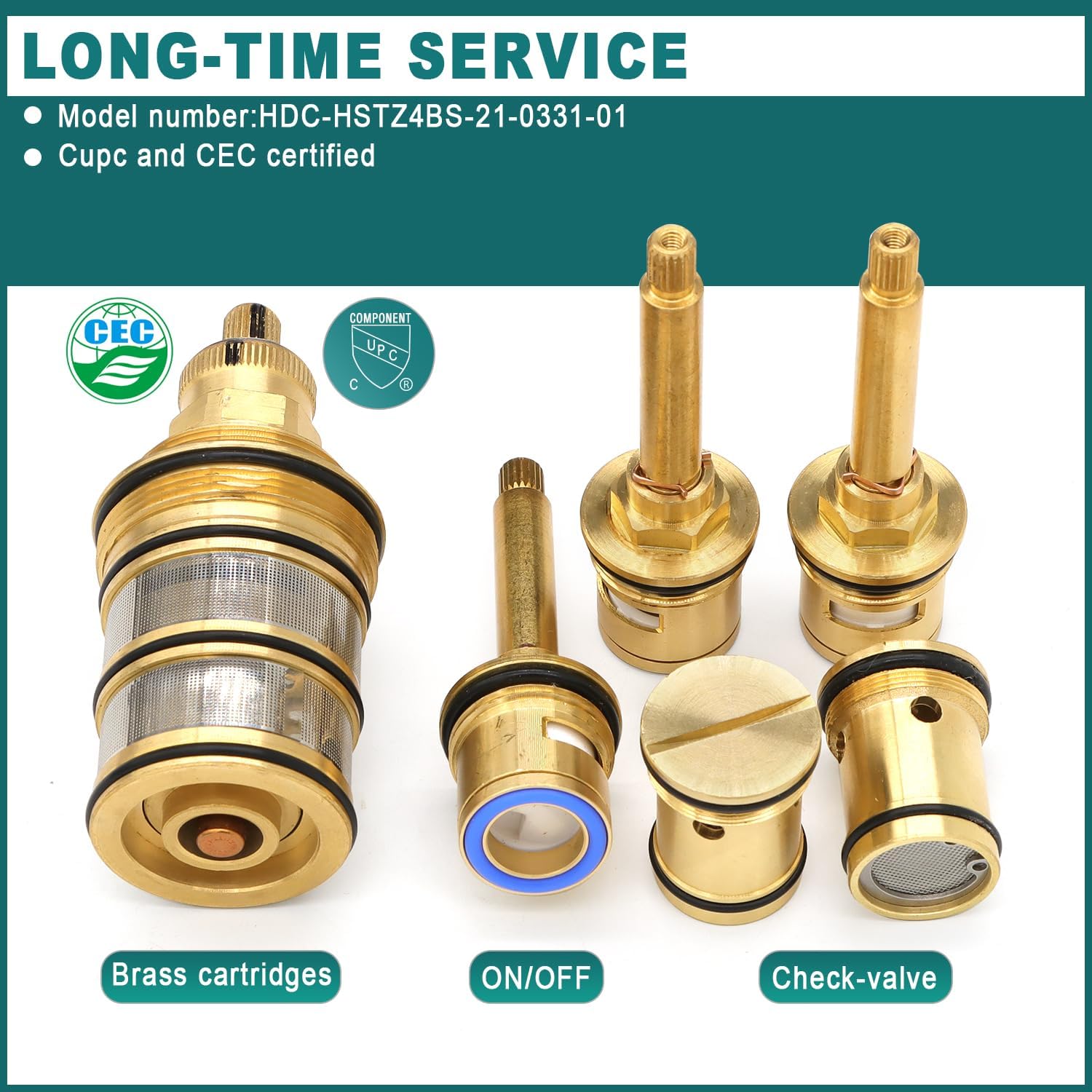 Shower valve cartridge replacement includes 1 temperature cartridge, 3 on/off cartridges, and 2 check valves. All brass casting is rustproof and durable.