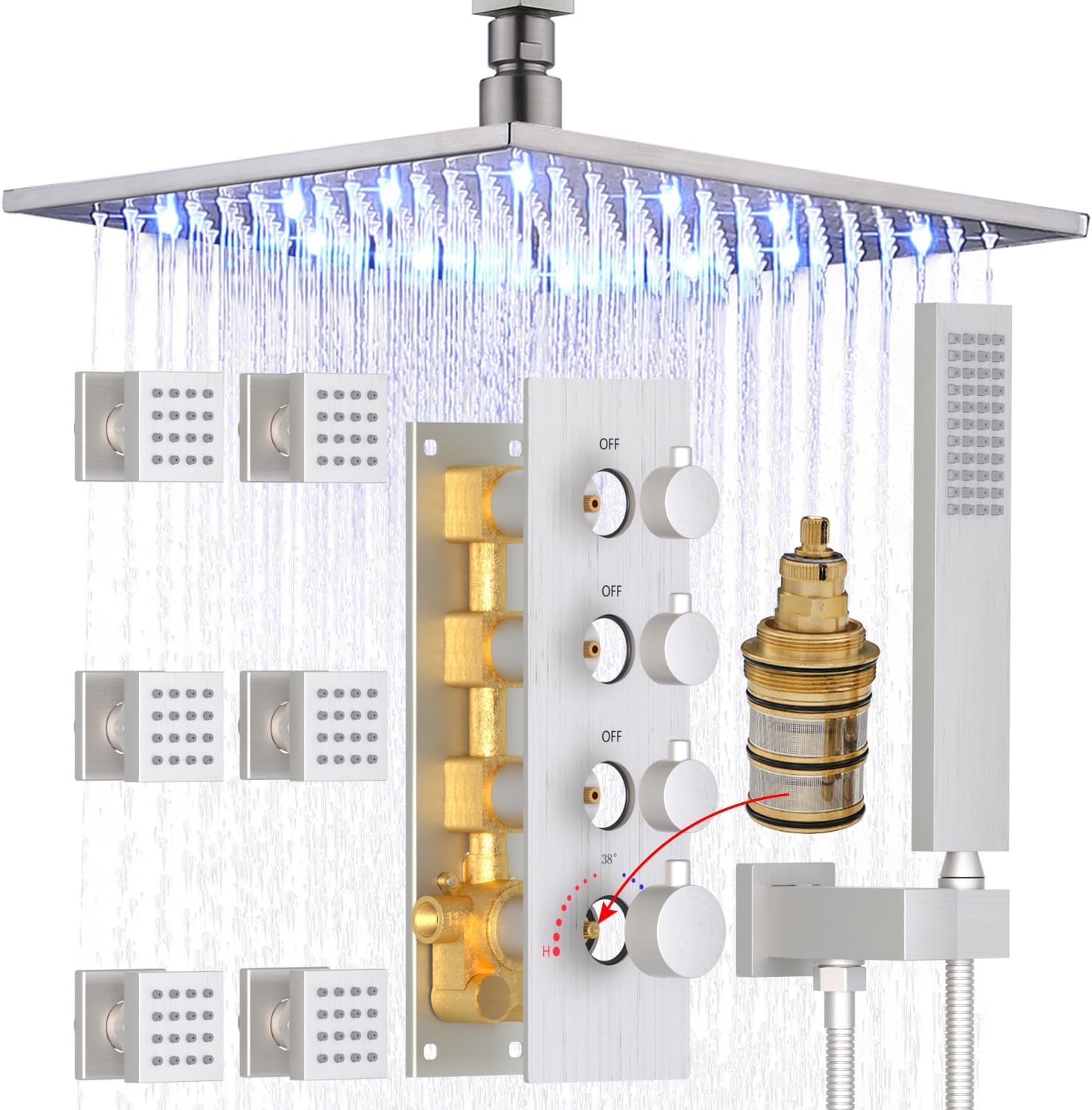 HOMEDEC Luxury LED Rainfall 16inch Shower Head System Brused Nickel with Body Spray Brass Faucet Combo Set, Large Flow, Can Use All Functions At a Time