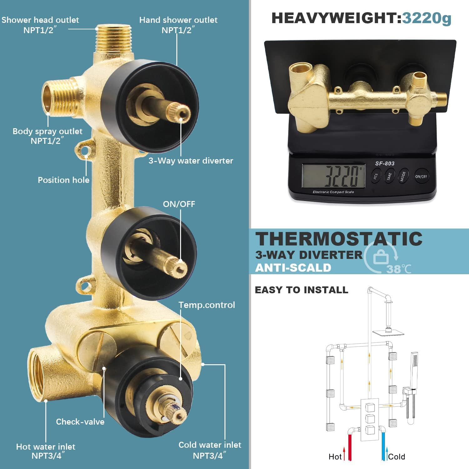 Valve connect size: Hot/cold inlet size is NPT3/4” (large flow out volume); Three outlets size is NPT1/2”, working Pressure: 0.05-1.0Mpa.
