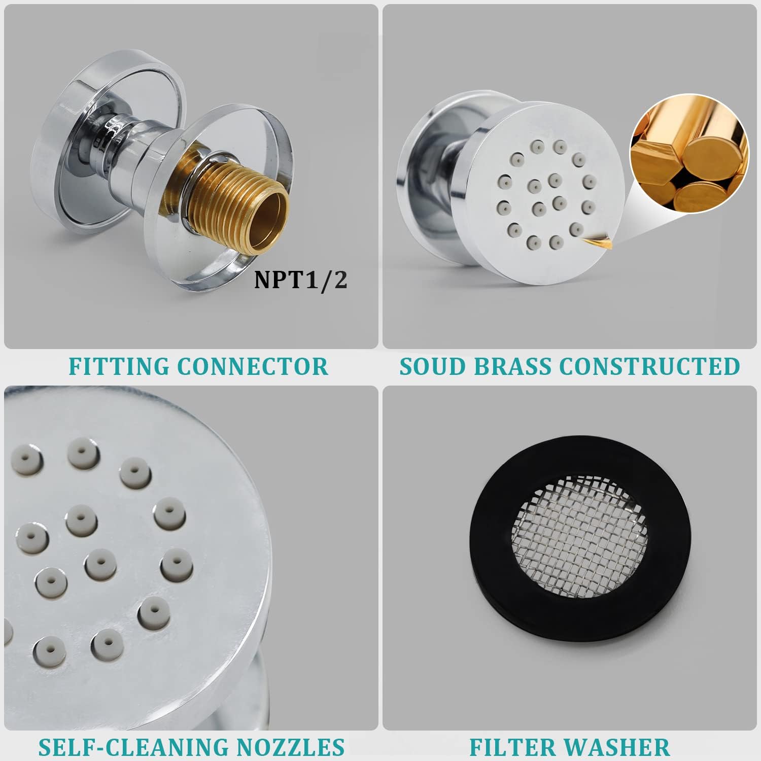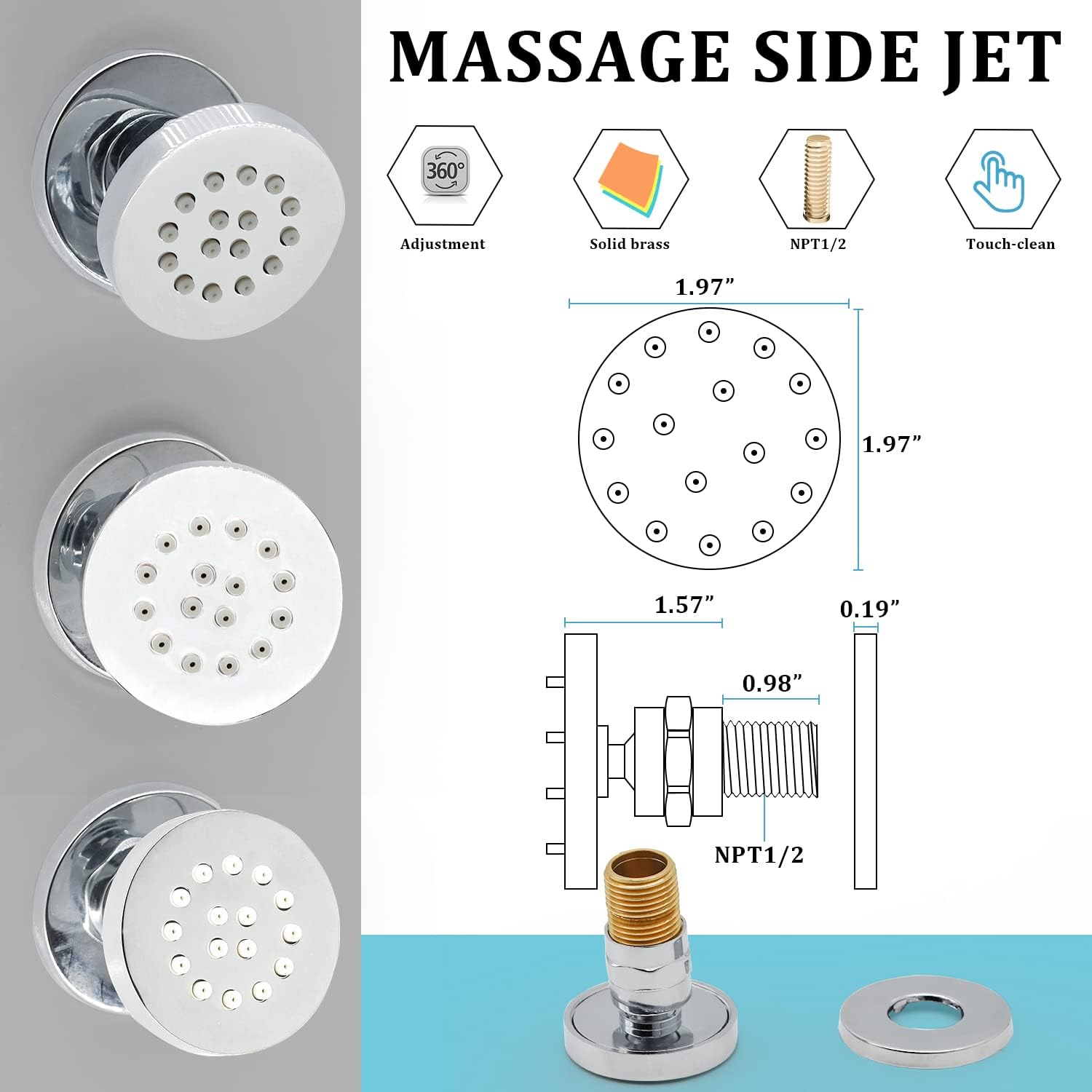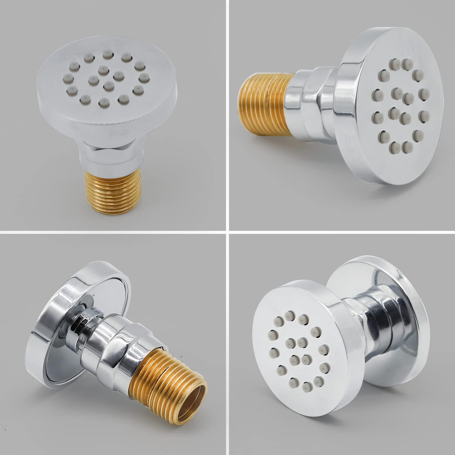 MATERIAL: High quality brass material, Chrome Finish SIZE: Dia 2inch.The size is marked on the picture CONCEALED INSTALLATION: Connect size NPT1/2”, Easy to Install. Fits Standard American. ADJUSTABLE: Up/down/left/right rotation direction, corresponding to the requirements of you and your family. INCLUDING: 4 pcs brass shower spa body jet, which can let you feel the home…