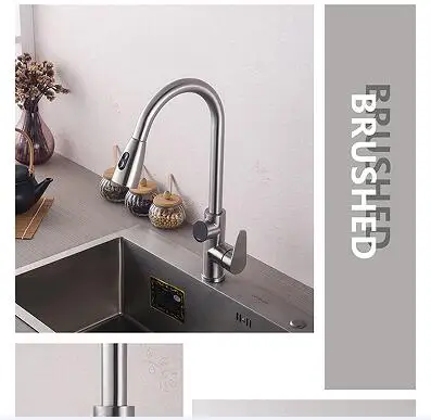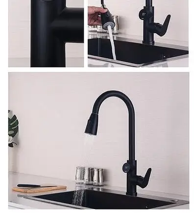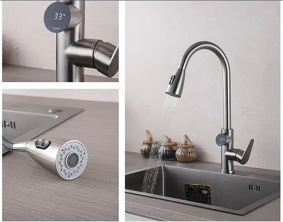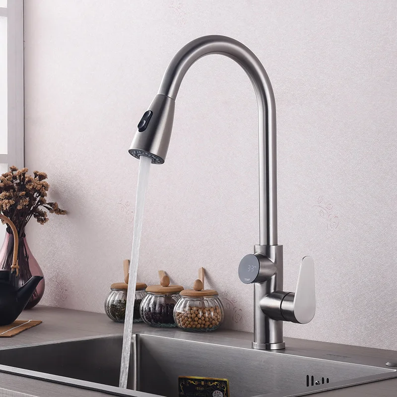 LED Digital Display Brushed Kitchen Taps Single Level Stainless Steel Faucets