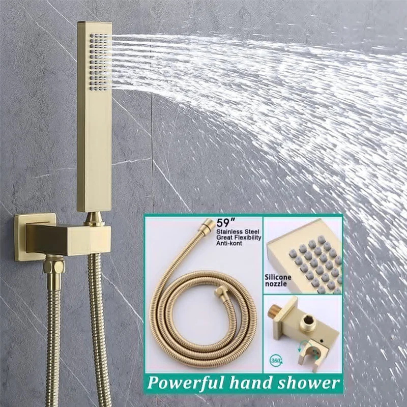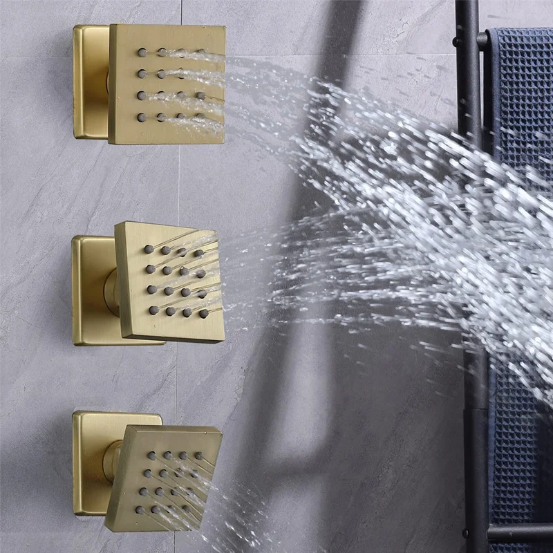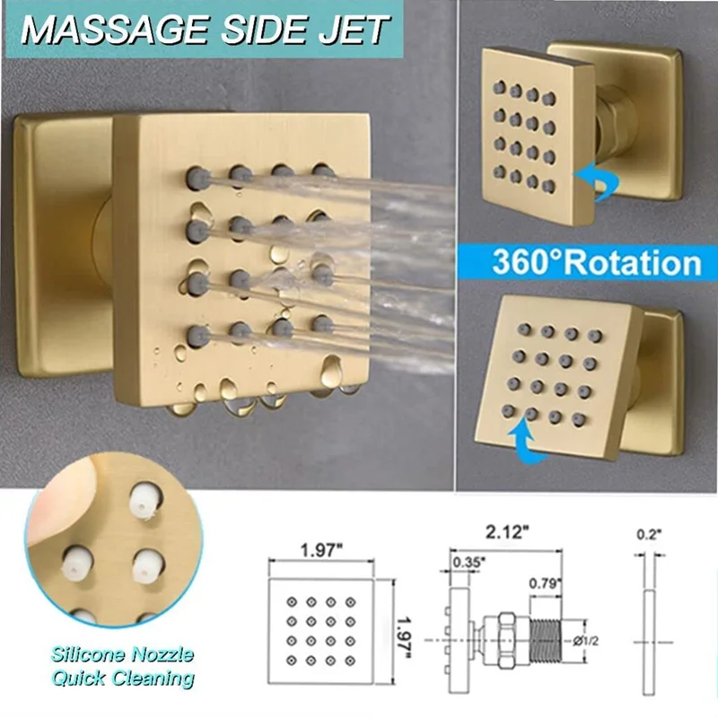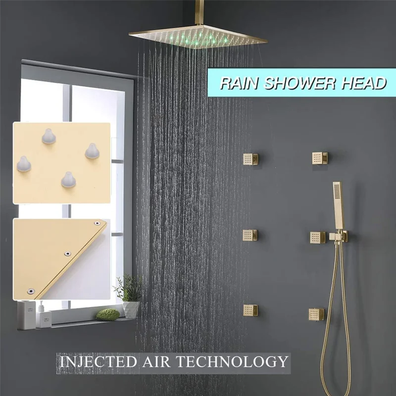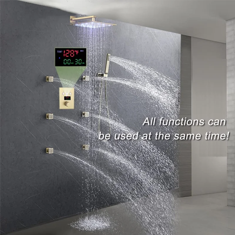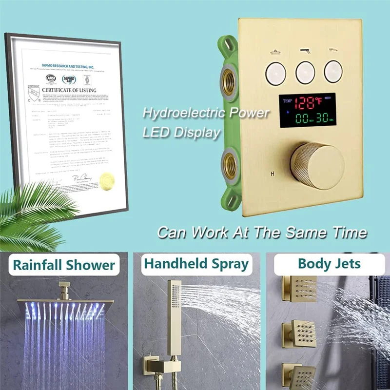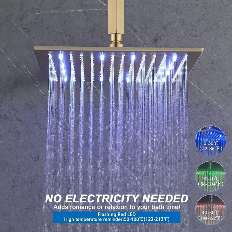 Why Choose Us Details Images Color Brushed Gold Material Stainless Steel, Brass Shower System Type 3 Function Finish Type Brushed Style 12 Inch Digital Temperature Display Shower Set Shape Square Included Components Body Jets Sprays System with Temperature LCD Display Valve Trim Kit LED color changing with water temperature Blue: 0-30℃(32-86℉),  Green: 30-40℃(86-104℉),  Red: 40-50℃(104-122℉), …