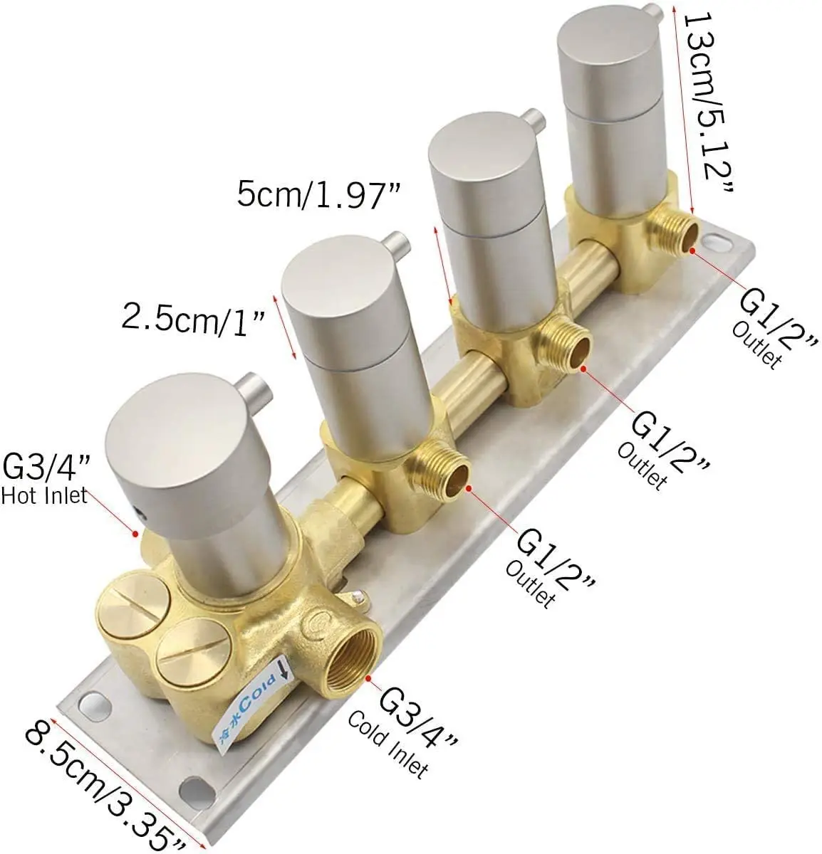 Comes with 3/4″ hot & cold water inlet, three 1/2″ outlets. More powerful water flows out when you turn on the switch handle. Fill
