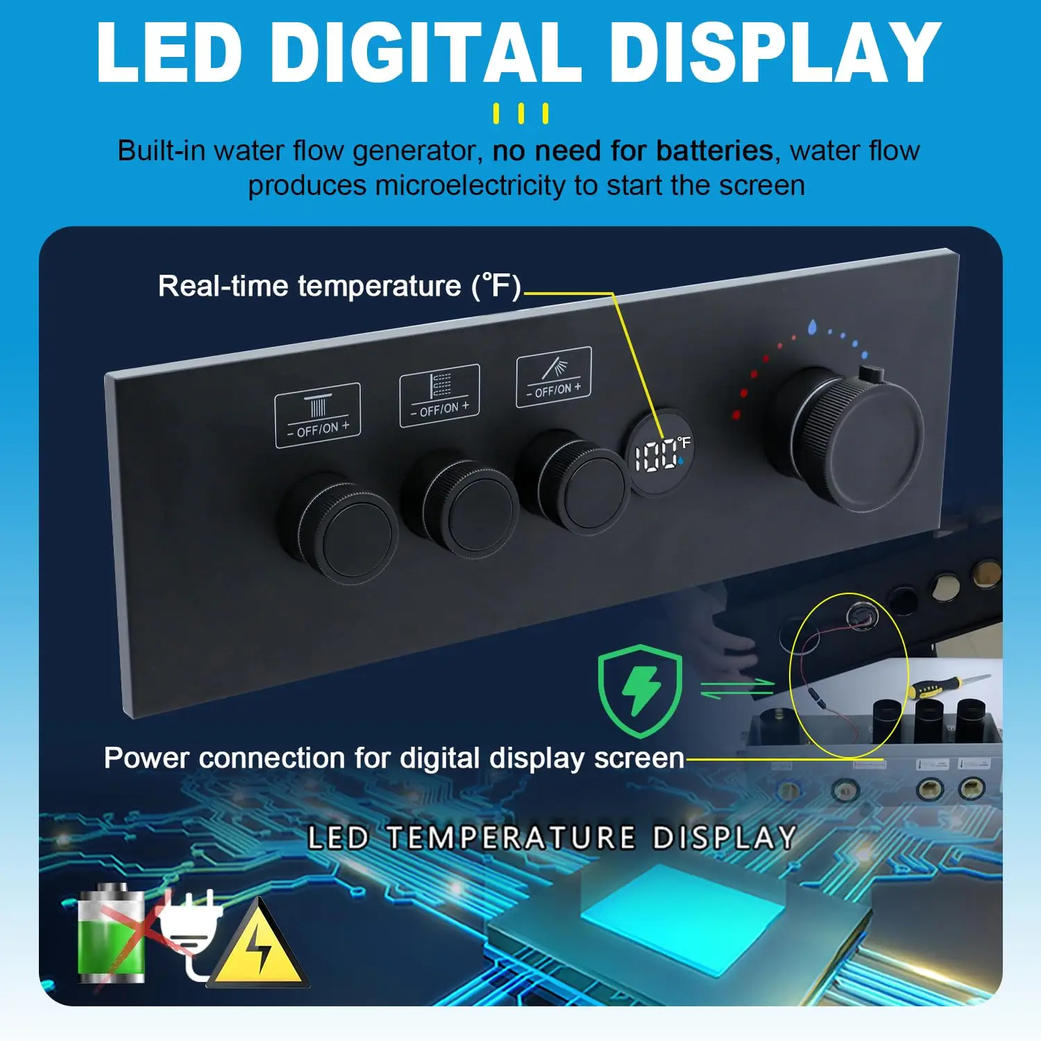 【Digital Display Shower System】16 inch thermostatic rain shower system is equipped with LED intelligent digital display screen of hydroelectric power generation without battery, real-time display of water temperature. You can fine-tune the water temperature to your liking at any time, fast and precise.