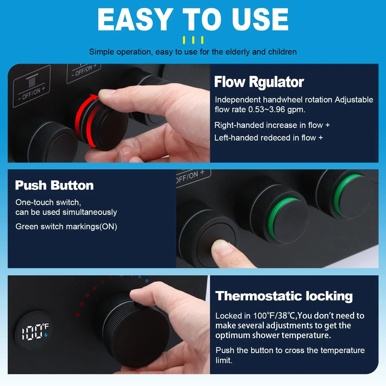 【Thermostatic Temperature Control】The digital thermostatic valve allows you to set and maintain a precise water temperature for your shower. This ensures a comfortable and consistent showering experience. Pressure balancing shower diverter with a safety lock that you do not need to adjust the temperature every time you shower.