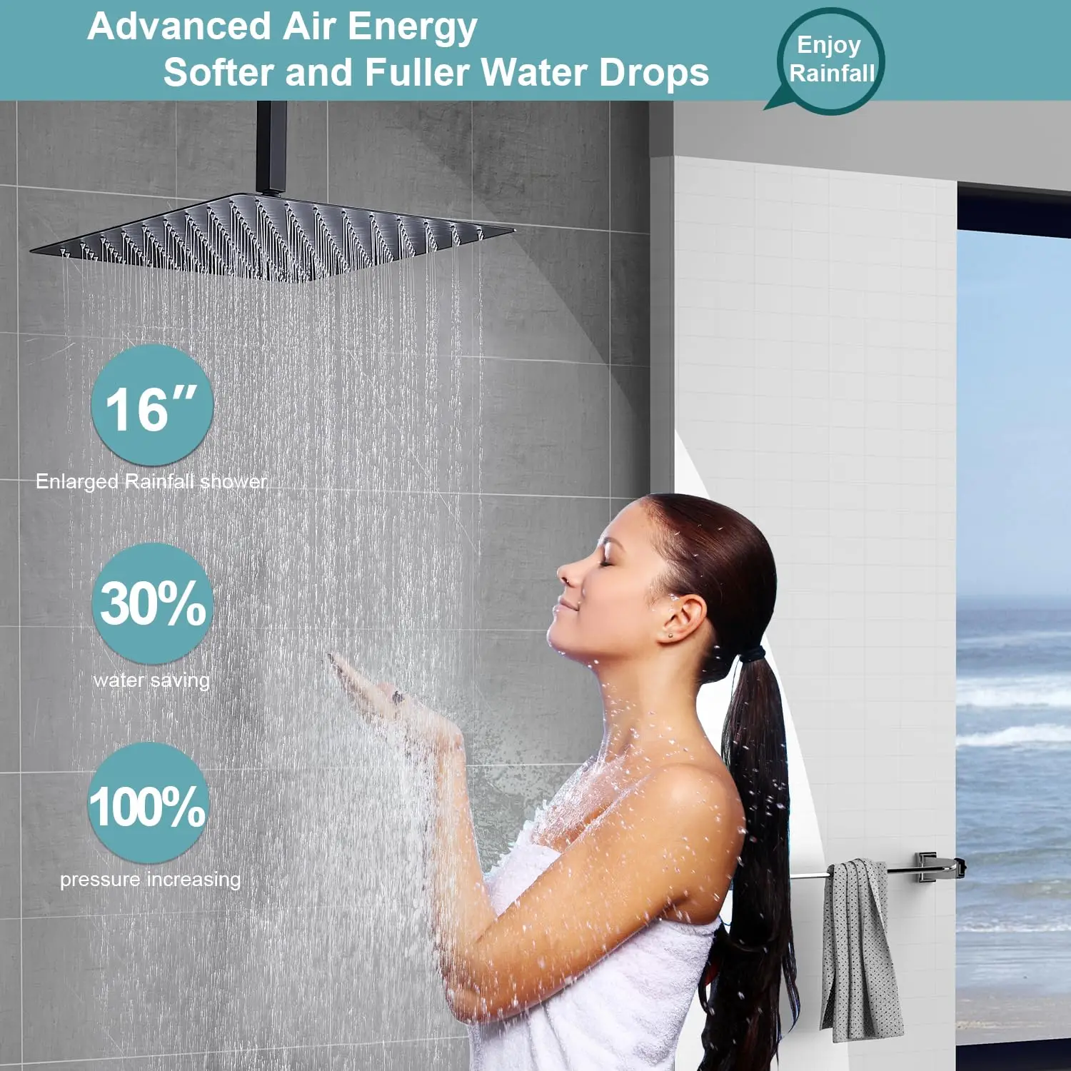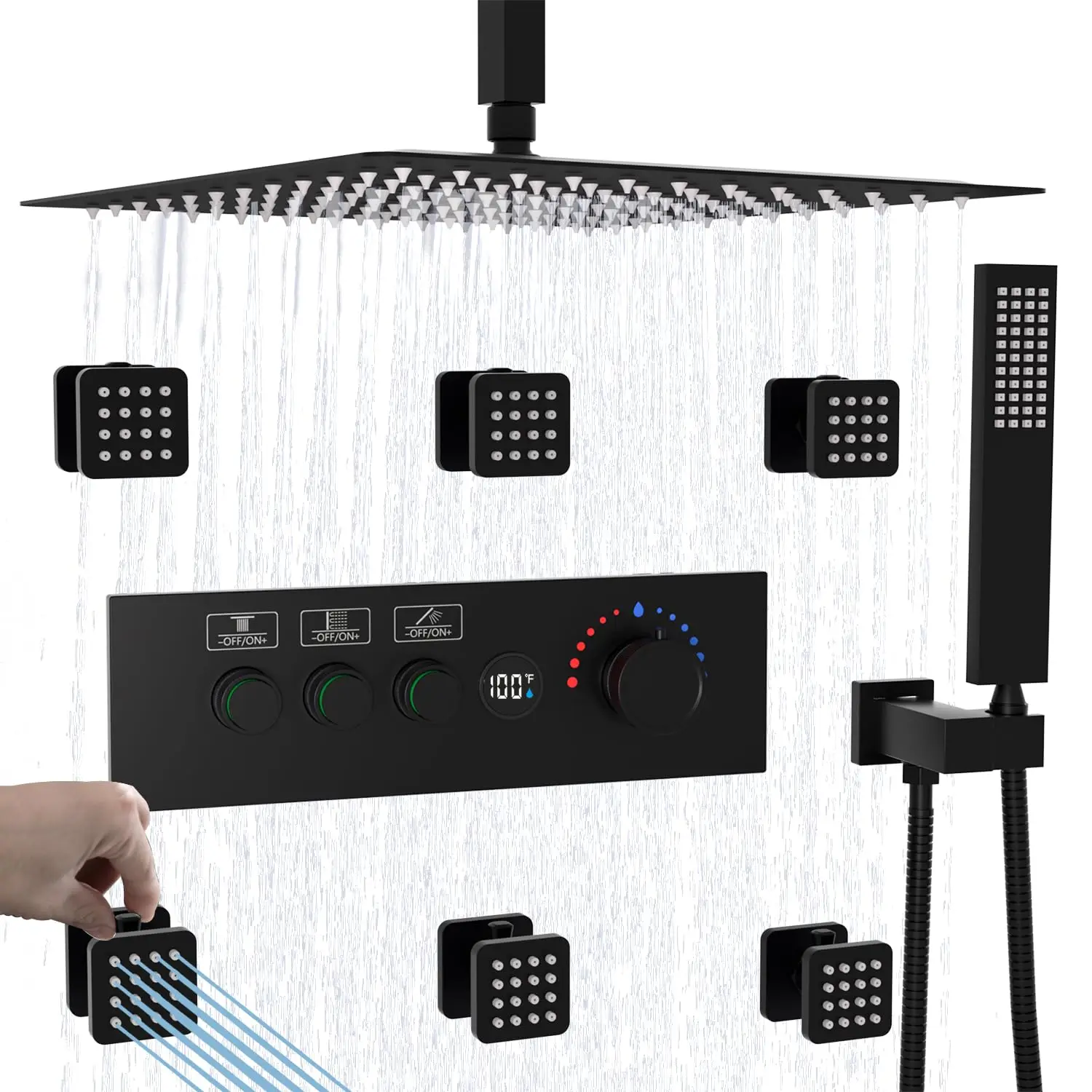 【16 Inch Rain Shower & On-Off Switch Body Jets】Ultra-thin 16-inch shower head, bring you rain shower experience, mix air and water to simulate the feeling of natural rainfall, enjoy the high flow shower space, and it also can accommodate two people to bathe at the same time. Patented spa body jets with shutoff, turn the knob to control flow and pressure as you like.