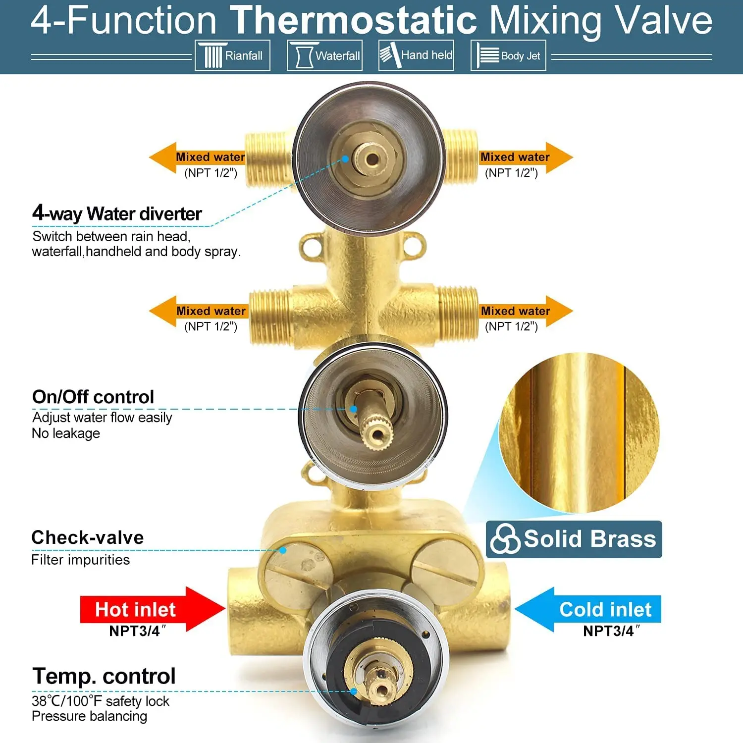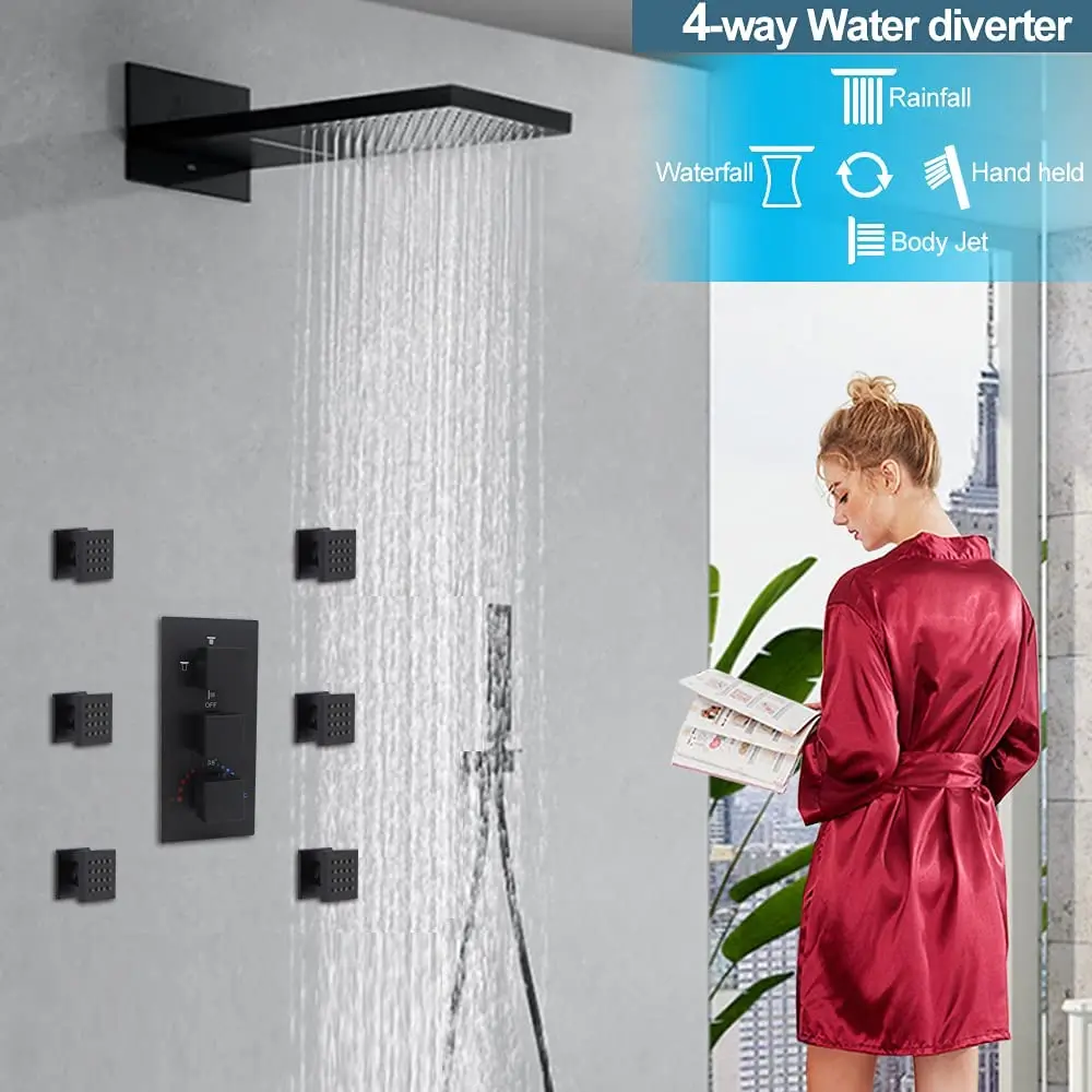 Thermostatic Shower Panel Dual-function Rainfall Shower Head with Body Jet and Handheld Sprayer, Solid Brass Shower Faucet sets
