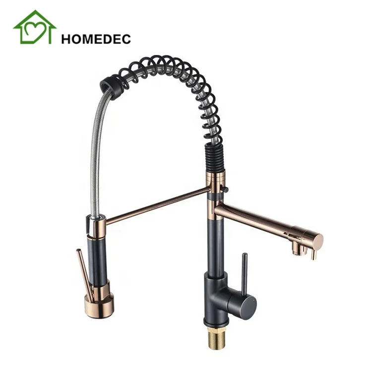 Featuring a dual-tone finish of black and rose gold, this kitchen faucet doesn’t just serve its purpose – it elevates the style quotient of your kitchen space. The sleek design of this kitchen faucet, combined with its high-arc spring spout, offers flexibility second to none. Whether you’re filling a pot or washing dishes, this fixture ensures that you do so with comfort and precision, making everyday kitchen tasks a breeze. Moreover, the dual-function sprayer allows seamless switching between stream and spray modes, catering to various needs with utmost efficiency.