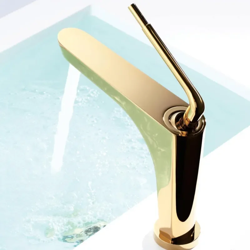 This particular basin faucet stands out with its sleek, contemporary design. The smoothly curved spout, combined with clean lines, gives it a minimalist yet sophisticated appearance. It’s more than just a visual delight; the ergonomic lever of this faucet basin allows for effortless control over water flow and temperature, providing a seamless user experience. Mounted on a sturdy cylindrical base, this faucet ensures stability and durability, making it a reliable addition to any space. The golden finish adds a touch of opulence, helping to create an inviting and luxurious ambiance.